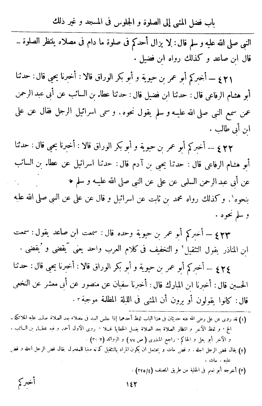 ٤٢٤ - أَخْبَرَكُمْ أَبُو عُمَرَ بْنُ حَيَوَيْهِ، وَأَبُو بَكْرٍ الْوَرَّاقُ قَالَا: أَخْبَرَنَا يَحْيَى قَالَ: حَدَّثَنَا الْحُسَيْنُ قَالَ: أَخْبَرَنَا ابْنُ الْمُبَارَكِ قَالَ: أَخْبَرَنَا سُفْيَانُ، عَنْ مَنْصُورٍ، عَنْ أَبِي مَعْشَرٍ، عَنِ النَّخَعِيِّ قَالَ: «كَانُوا يَقُولُونَ، أَوْ يَرَوْنَ أَنَّ الْمَشْيَ فِي اللَّيْلَةِ الْمُظْلِمَةِ مُوجِبَةٌ»