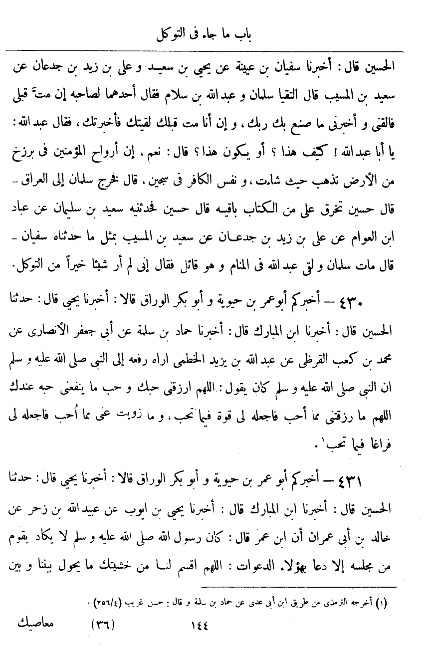 ٤٣٠ - أَخْبَرَكُمْ أَبُو عُمَرَ بْنُ حَيَوَيْهِ، وَأَبُو بَكْرٍ الْوَرَّاقُ قَالَا: أَخْبَرَنَا يَحْيَى قَالَ: حَدَّثَنَا الْحُسَيْنُ قَالَ: أَخْبَرَنَا ابْنُ الْمُبَارَكِ قَالَ: أَخْبَرَنَا حَمَّادُ بْنُ سَلَمَةَ، عَنْ أَبِي جَعْفَرٍ الْأَنْصَارِيِّ، عَنْ مُحَمَّدِ بْنِ كَعْبٍ الْقُرَظِيِّ، عَنْ عَبْدِ اللَّهِ بْنِ يَزِيدَ الْخَطْمِيِّ، أُرَاهُ رَفَعَهُ إِلَى النَّبِيِّ صَلَّى اللهُ عَلَيْهِ وَسَلَّمَ، أَنَّ النَّبِيَّ صَلَّى اللهُ عَلَيْهِ وَسَلَّمَ كَانَ يَقُولُ: «اللَّهُمَّ ارْزُقْنِي حُبَّكَ وَحُبَّ مَا يَنْفَعُنِي حُبُّهُ عِنْدَكَ، اللَّهُمَّ مَا رَزَقْتَنِي مِمَّا أُحِبُّ، فَاجْعَلْهُ لِي قُوَّةً فِيمَا تُحِبُّ، وَمَا زَوَيْتَ عَنِّي مَا أُحِبُّ، فَاجْعَلْهُ لِي فَرَاغًا فِيمَا تُحِبُّ»