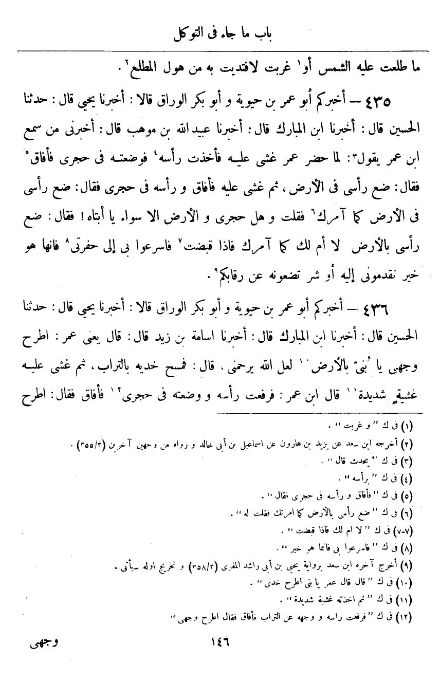 ٤٣٦ - أَخْبَرَكُمْ أَبُو عُمَرَ بْنُ حَيَوَيْهِ، وَأَبُو بَكْرٍ الْوَرَّاقُ قَالَا: أَخْبَرَنَا يَحْيَى قَالَ: حَدَّثَنَا الْحُسَيْنُ قَالَ: أَخْبَرَنَا ابْنُ الْمُبَارَكِ قَالَ: أَخْبَرَنَا أُسَامَةُ بْنُ زَيْدٍ قَالَ: قَالَ: يَعْنِي عُمَرَ: «اطْرَحْ وَجْهِي يَا بُنِيَّ بِالْأَرْضِ , لَعَلَّ اللَّهَ يَرْحَمُنِي» ، قَالَ: فَمَسَحَ خَدَّيْهِ بِالتُّرَابِ، ثُمَّ غُشِيَ عَلَيْهِ غَشْيَةً شَدِيدَةً، قَالَ ابْنُ عُمَرَ: فَرَفَعْتُ رَأْسَهُ , وَوَضَعْتُهُ فِي حِجْرِي، فَأَفَاقَ، فَقَالَ: «اطْرَحْ ⦗١٤٧⦘ وَجْهِي عَلَى التُّرَابِ لَعَلَّ اللَّهَ تَعَالَى أَنْ يَرْحَمَنِي» ، ثُمَّ قَالَ: «وَيْلٌ لِعُمَرَ وَوَيْلٌ لِأُمِّهِ إِنْ لَمْ يُغْفَرْ لَهُ»