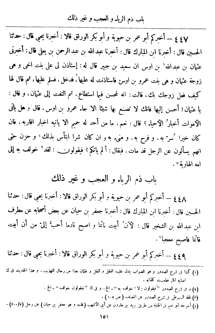 ٤٤٨ - أَخْبَرَكُمْ أَبُو عُمَرَ بْنُ حَيَوَيْهِ، وَأَبُو بَكْرٍ الْوَرَّاقُ قَالَا: أَخْبَرَنَا يَحْيَى قَالَ: حَدَّثَنَا الْحُسَيْنُ قَالَ: أَخْبَرَنَا ابْنُ الْمُبَارَكِ قَالَ: أَخْبَرَنَا جَعْفَرُ بْنُ حَيَّانَ، عَنْ بَعْضِ أَصْحَابِهِ، عَنْ مُطَرِّفِ بْنِ عَبْدِ اللَّهِ بْنِ الشِّخِّيرِ قَالَ: «لَأَنْ أَبِيتَ نَائِمًا وَأُصْبِحَ نَادِمًا، أَحَبُّ إِلَيَّ مِنْ أَنْ أَبِيتَ قَائِمًا، فَأُصْبِحَ مُعْجَبًا»