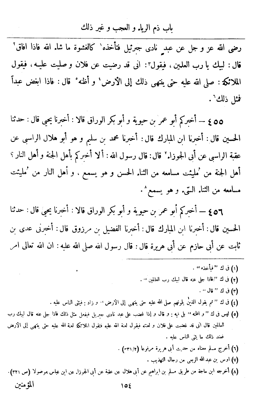 ٤٥٥ - أَخْبَرَكُمْ أَبُو عُمَرَ بْنُ حَيَوَيْهِ، وَأَبُو بَكْرٍ الْوَرَّاقُ قَالَا: أَخْبَرَنَا يَحْيَى قَالَ: حَدَّثَنَا الْحُسَيْنُ قَالَ: أَخْبَرَنَا ابْنُ الْمُبَارَكِ قَالَ: أَخْبَرَنَا مُحَمَّدُ بْنُ سُلَيْمٍ وَهُوَ أَبُو هِلَالٍ الرَّاسِبِيُّ، عَنْ عُقْبَةَ الرَّاسِبِيِّ، عَنْ أَبِي الْجَوْزَاءِ قَالَ: قَالَ رَسُولُ اللَّهِ صَلَّى اللهُ عَلَيْهِ وَسَلَّمَ: «أَلَا أُخْبِرُكُمْ بِأَهْلِ الْجَنَّةِ، وَأَهْلِ النَّارِ؟ أَهْلُ الْجَنَّةِ مَنْ مُلِئَتْ مَسَامِعُهُ مِنَ الثَّنَاءِ الْحَسَنِ وَهُوَ يَسْمَعُ، وَأَهْلُ النَّارِ مَنْ مُلِئَتْ مَسَامِعُهُ مِنَ الثَّنَاءِ السَّيِّئِ وَهُوَ يَسْمَعُ»