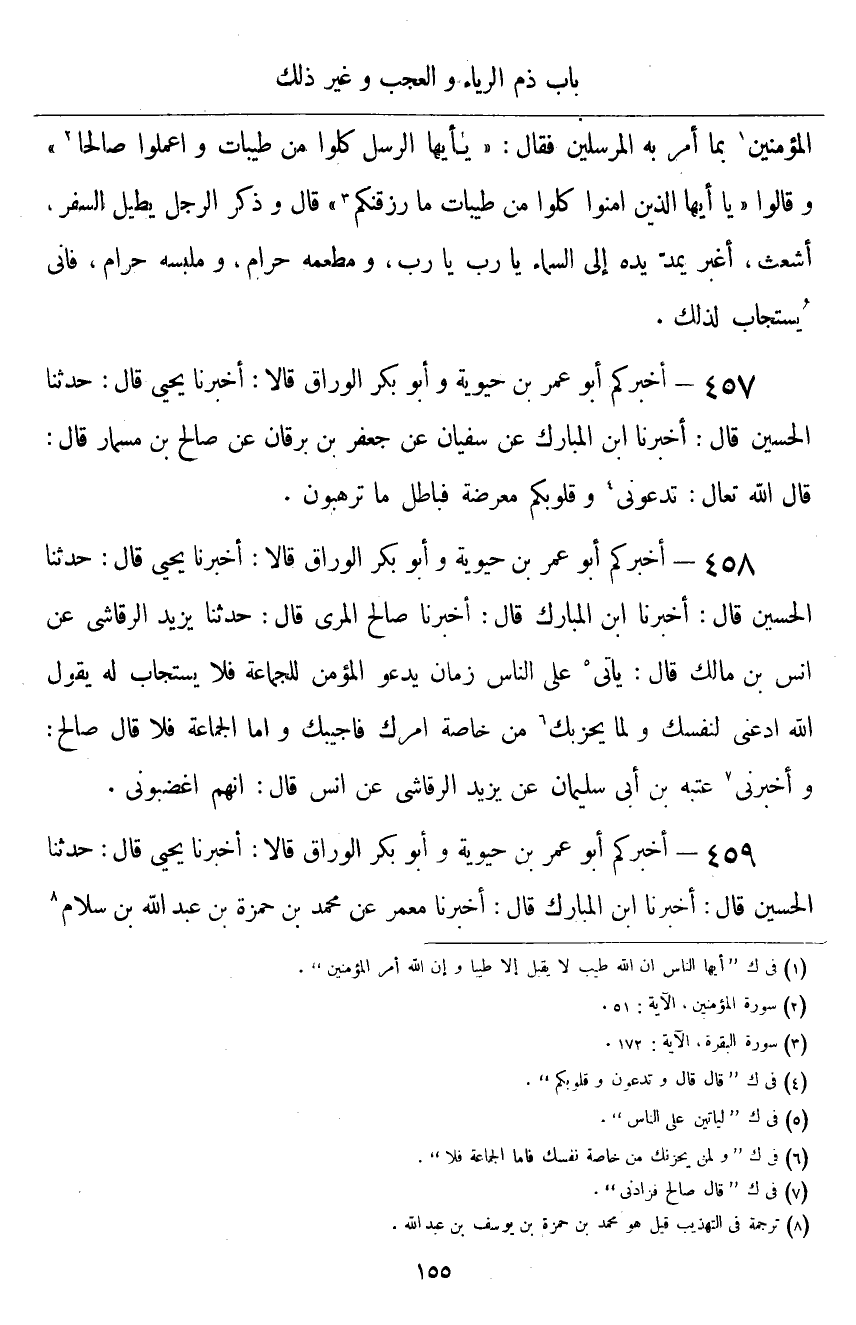 ٤٥٧ - أَخْبَرَكُمْ أَبُو عُمَرَ بْنُ حَيَوَيْهِ، وَأَبُو بَكْرٍ الْوَرَّاقُ قَالَا: أَخْبَرَنَا يَحْيَى قَالَ: حَدَّثَنَا الْحُسَيْنُ قَالَ: أَخْبَرَنَا ابْنُ الْمُبَارَكِ قَالَ: عَنْ سُفْيَانَ، عَنْ جَعْفَرِ بْنِ بُرْقَانَ، عَنْ صَالِحِ بْنِ مِسْمَارٍ قَالَ: قَالَ اللَّهُ تَعَالَى: «تَدْعُونِي وَقُلُوبُكُمْ مُعْرِضَةٌ، فَبَاطِلٌ مَا تَرْهَبُونَ»