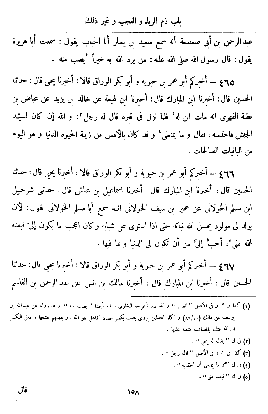 ٤٦٧ - أَخْبَرَكُمْ أَبُو عُمَرَ بْنُ حَيَوَيْهِ، وَأَبُو بَكْرٍ الْوَرَّاقُ قَالَا: أَخْبَرَنَا يَحْيَى قَالَ: حَدَّثَنَا الْحُسَيْنُ قَالَ: أَخْبَرَنَا ابْنُ الْمُبَارَكِ قَالَ: أَخْبَرَنَا مَالِكُ بْنُ أَنَسٍ، عَنْ عَبْدِ الرَّحْمَنِ بْنِ الْقَاسِمِ ⦗١٥٩⦘، قَالَ: قَالَ رَسُولُ اللَّهِ صَلَّى اللهُ عَلَيْهِ وَسَلَّمَ: «لِيُعَزِّي الْمُسْلِمِينَ عَنْ مَصَائِبِهِمْ، الْمُصِيبَةُ بِي»