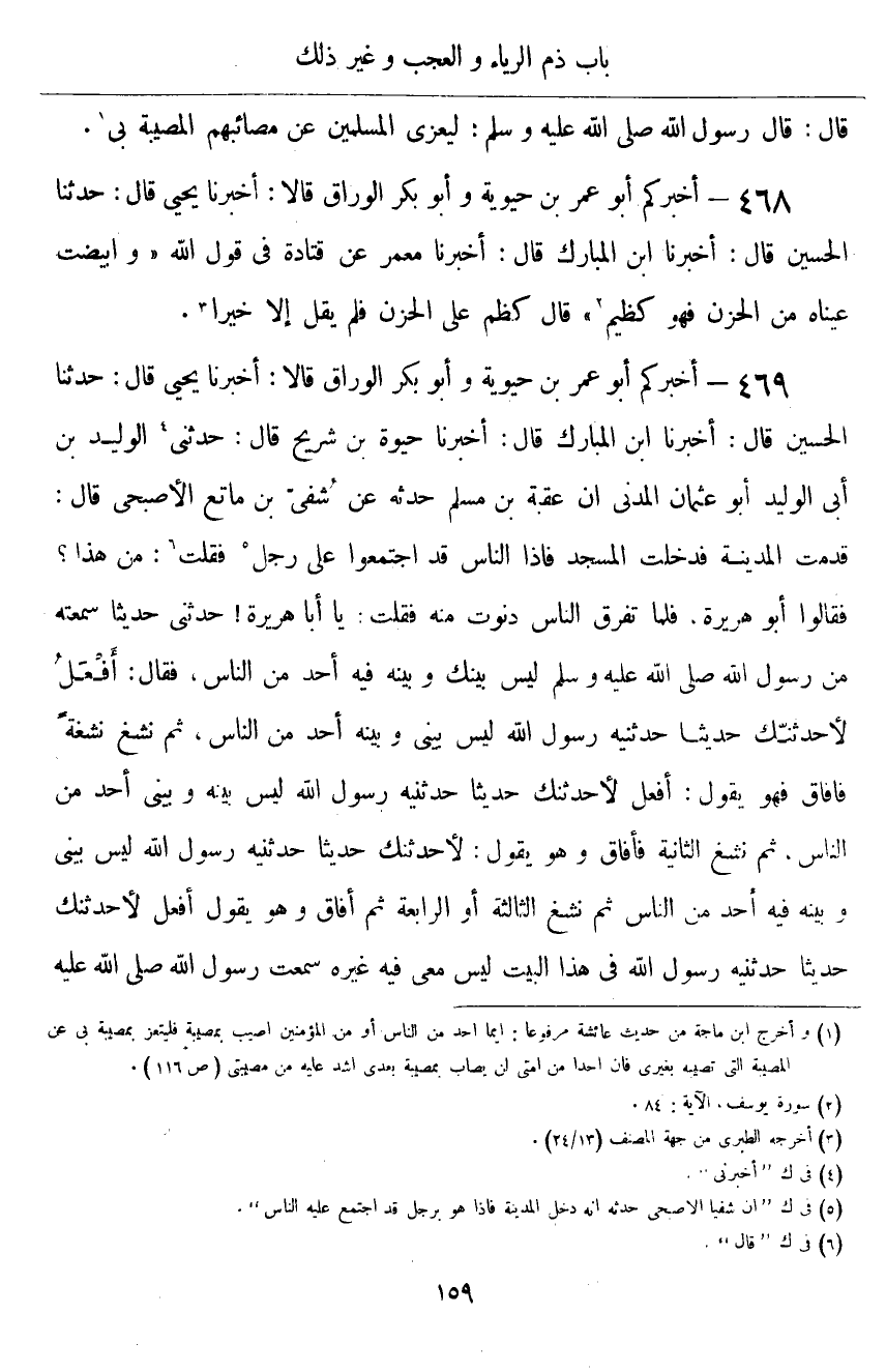٤٦٩ - أَخْبَرَكُمْ أَبُو عُمَرَ بْنُ حَيَوَيْهِ، وَأَبُو بَكْرٍ الْوَرَّاقُ قَالَا: أَخْبَرَنَا يَحْيَى قَالَ: حَدَّثَنَا الْحُسَيْنُ قَالَ: أَخْبَرَنَا ابْنُ الْمُبَارَكِ قَالَ: أَخْبَرَنَا حَيْوَةُ بْنُ شُرَيْحٍ قَالَ: حَدَّثَنِي الْوَلِيدُ بْنُ أَبِي الْوَلِيدِ أَبُو عُثْمَانَ الْمَدَنِيُّ، أَنَّ عُقْبَةَ بْنَ مُسْلِمٍ، حَدَّثَهُ عَنْ شُفَيِّ بْنِ مَاتِعٍ الْأَصْبَحِيِّ قَالَ: قَدِمْتُ الْمَدِينَةَ فَدَخَلْتُ الْمَسْجِدَ، فَإِذَا النَّاسُ قَدِ اجْتَمَعُوا عَلَى رَجُلٍ، فَقُلْتُ: مَنْ هَذَا؟ فَقَالُوا أَبُو هُرَيْرَةَ: فَلَمَّا تَفَرَّقَ النَّاسُ دَنَوْتُ مِنْهُ، فَقُلْتُ: يَا أَبَا هُرَيْرَةَ حَدِّثْنِي حَدِيثًا سَمِعْتَهُ مِنْ رَسُولِ اللَّهِ صَلَّى اللهُ عَلَيْهِ وَسَلَّمَ لَيْسَ بَيْنَكَ وَبَيْنَهُ فِيهِ أَحَدٌ مِنَ النَّاسِ، فَقَالَ: أَفْعَلُ، لَأُحَدِّثَنَّكَ حَدِيثًا حَدَّثَنِيهِ رَسُولُ اللَّهِ صَلَّى اللهُ عَلَيْهِ وَسَلَّمَ لَيْسَ بَيْنِي وَبَيْنَهُ أَحَدٌ مِنَ النَّاسِ، ثُمَّ نَشَغَ نَشْغَةً فَأَفَاقَ، فَهُوَ يَقُولُ: أَفْعَلُ لَأُحَدِّثَنَّكَ حَدِيثًا حَدَّثَنِيهِ رَسُولُ اللَّهِ صَلَّى اللهُ عَلَيْهِ وَسَلَّمَ لَيْسَ بَيْنَهُ وَبَيْنِي أَحَدٌ مِنَ النَّاسِ، ثُمَّ نَشَغَ الثَّانِيَةَ فَأَفَاقَ، وَهُوَ يَقُولُ: لَأُحَدِّثَنَّكَ حَدِيثًا حَدَّثَنِيهِ رَسُولُ اللَّهِ صَلَّى اللهُ عَلَيْهِ وَسَلَّمَ لَيْسَ بَيْنِي وَبَيْنَهُ فِيهِ أَحَدٌ مِنَ النَّاسِ، ثُمَّ نَشَغَ الثَّالِثَةَ، أَوِ الرَّابِعَةَ ثُمَّ أَفَاقَ، وَهُوَ يَقُولُ: أَفْعَلُ , لَأُحَدِّثَنَّكَ حَدِيثًا حَدَّثَنِيهِ رَسُولُ اللَّهِ صَلَّى اللهُ عَلَيْهِ وَسَلَّمَ فِي هَذَا الْبَيْتِ لَيْسَ مَعِي فِيهِ غَيْرُهُ، سَمِعْتُ رَسُولَ اللَّهِ صلّى الله عليه ⦗١٦٠⦘ وسلم يَقُولُ: " إِذَا كَانَ يَوْمُ الْقِيَامَةِ، يَنْزِلُ اللَّهُ إِلَى عِبَادِهِ لِيَقْضِيَ بَيْنَهُمْ، فَكُلُّ أُمَّةٍ جَاثِيَةٌ، فَأَوَّلُ مَنْ يُدْعَى رَجُلٌ جَمَعَ الْقُرْآنَ، فَيَقُولُ اللَّهُ تَعَالَى لَهُ: عَبْدِي، أَلَمْ أُعَلِّمْكَ مَا أَنْزَلْتُ عَلَى رَسُولِي؟ فَيَقُولُ: بَلَى يَا رَبِّ، فَيَقُولُ: مَاذَا عَمِلْتَ فِيمَا عَلَّمْتُكَ؟ فَيَقُولُ: يَا رَبِّ، كُنْتُ أَقُومُ بِهِ آنَاءَ اللَّيْلِ، وَآنَاءَ النَّهَارِ، فَيَقُولُ اللَّهُ لَهُ: كَذَبْتَ، وَتَقُولُ لَهُ الْمَلَائِكَةُ: كَذَبْتَ، بَلْ أَرَدْتَ أَنْ يُقَالَ: فُلَانٌ قَارِئٌ، فَقَدْ قِيلَ ذَاكَ، اذْهَبْ فَلَيْسَ لَكَ الْيَوْمَ عِنْدَنَا شَيْءٌ، ثُمَّ يُؤْتَى بِصَاحِبِ الْمَالِ، فَيَقُولُ اللَّهُ لَهُ: عَبْدِي، أَلَمْ أُنْعِمْ عَلَيْكَ؟ أَلَمْ أُفْضِلْ عَلَيْكَ؟ أَلَمْ أُوَسِّعْ عَلَيْكَ؟ أَوْ نَحْوَهُ، فَيَقُولُ: بَلَى يَا رَبِّ، فَيَقُولُ: مَاذَا عَمِلْتَ فِيمَا آتَيْتُكَ؟ فَيَقُولُ: يَا رَبِّ كُنْتُ أَصِلُ الرَّحِمَ، وَأَتَصَدَّقُ، وَأَفْعَلُ، وَأَفْعَلُ، فَيَقُولُ اللَّهُ: كَذَبْتَ، وَتَقُولُ لَهُ الْمَلَائِكَةُ: كَذَبْتَ، بَلْ أَرَدْتَ أَنْ يُقَالَ: فُلَانٌ جَوَادٌ، فَقَدْ قِيلَ ذَاكَ، اذْهَبْ فَلَيْسَ لَكَ عِنْدَنَا الْيَوْمَ شَيْءٌ، وَيُدْعَى الْمَقْتُولُ، فَيَقُولُ اللَّهُ لَهُ: عَبْدِي، فِيمَ قُتِلْتَ؟ فَيَقُولُ: يَا رَبِّ، فَيكَ، وَفِي سَبِيلِكَ، فَيَقُولُ اللَّهُ تَعَالَى: كَذَبْتَ، وَتَقُولُ لَهُ الْمَلَائِكَةُ: كَذَبْتَ، بَلْ أَرَدْتَ أَنْ يُقَالَ: فُلَانٌ جَرِيءٌ، فَقَدْ قِيلَ ذَاكَ، اذْهَبْ فَلَيْسَ لَكَ الْيَوْمَ عِنْدَنَا شَيْءٌ "، قَالَ أَبُو هُرَيْرَةَ: ثُمَّ ضَرَبَ رَسُولُ اللَّهِ صَلَّى اللهُ عَلَيْهِ وَسَلَّمَ يَدَهُ عَلَى رُكْبَتِي، ثُمَّ قَالَ: «يَا أَبَا هُرَيْرَةَ، أُولَئِكَ الثَّلَاثَةُ أَوَّلُ خَلْقِ اللَّهِ تُسَعَّرُ بِهِمُ النَّارُ يَ