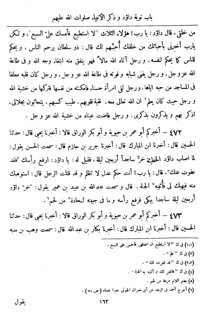 ٤٧٢ - أَخْبَرَكُمْ أَبُو عُمَرَ بْنُ حَيَوَيْهِ، وَأَبُو بَكْرٍ الْوَرَّاقُ قَالَا: أَخْبَرَنَا يَحْيَى قَالَ: حَدَّثَنَا الْحُسَيْنُ قَالَ: أَخْبَرَنَا ابْنُ الْمُبَارَكِ قَالَ: أَخْبَرَنَا جَرِيرُ بْنُ حَازِمٍ قَالَ: سَمِعْتُ الْحَسَنَ يَقُولُ: " لَمَّا أَصَابَ دَاوُدُ الْخَطِيئَةَ، خَرَّ سَاجِدًا أَرْبَعِينَ لَيْلَةً، فَقِيلَ لَهُ: يَا دَاوُدُ، ارْفَعْ رَأْسَكَ فَقَدْ عَفَوْتُ عَنْكَ، قَالَ: يَا رَبِّ، أَنْتَ حَكَمٌ عَدْلٌ لَا تَظْلِمُ، وَقَدْ قَتَلْتُ الرَّجُلَ، قَالَ: أَسْتَوْهِبُكَ مِنْهُ فَيَهَبُكَ لِي، فَأُثْنِيهِ الْجَنَّةَ "