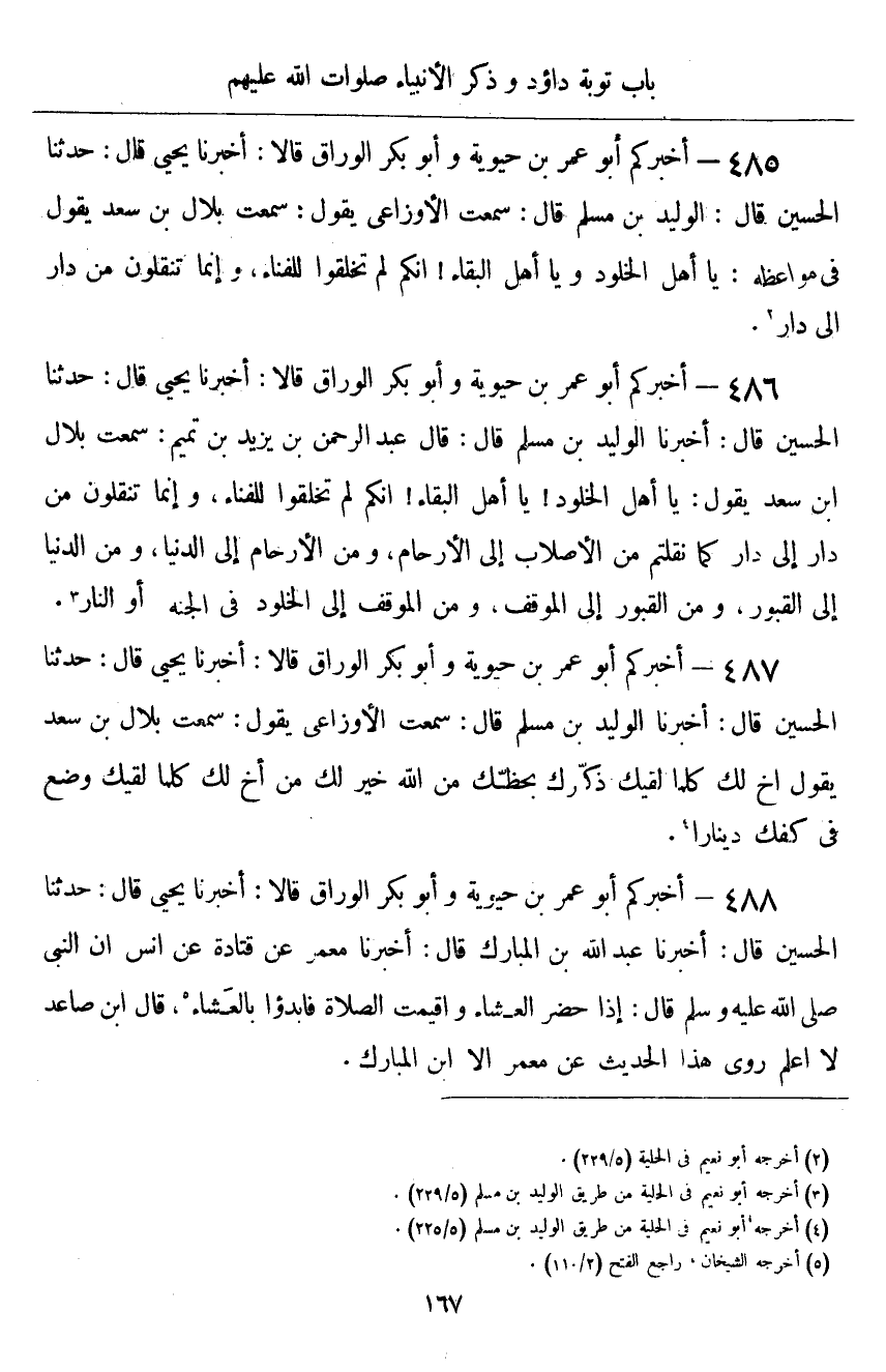 ٤٨٦ - أَخْبَرَكُمْ أَبُو عُمَرَ بْنُ حَيَوَيْهِ، وَأَبُو بَكْرٍ الْوَرَّاقُ قَالَا: أَخْبَرَنَا يَحْيَى قَالَ: حَدَّثَنَا الْحُسَيْنُ، قَالَ: أَخْبَرَنَا الْوَلِيدُ بْنُ مُسْلِمٍ قَالَ: قَالَ: عَبْدُ الرَّحْمَنِ بْنِ يَزِيدَ بْنِ تَمِيمٍ، سَمِعْتُ بِلَالَ بْنَ سَعْدٍ يَقُولُ: «يَا أَهْلَ الْخُلُودِ، يَا أَهْلَ الْبَقَاءِ، إِنَّكُمْ لَمْ تُخْلَقُوا لِلْفَنَاءِ، وَإِنَّمَا تُنْقَلُونَ مِنْ دَارٍ إِلَى دَارٍ، كَمَا نُقِلْتُمْ مِنَ الْأَصْلَابِ إِلَى الْأَرْحَامِ، وَمِنَ الْأَرْحَامِ إِلَى الدُّنْيَا، وَمِنَ الدُّنْيَا إِلَى الْقُبُورِ، وَمِنَ الْقُبُورِ إِلَى الْمَوْقِفِ، وَمِنَ الْمَوْقِفِ إِلَى الْخُلُودِ فِي الْجَنَّةِ أَوِ النَّارِ»