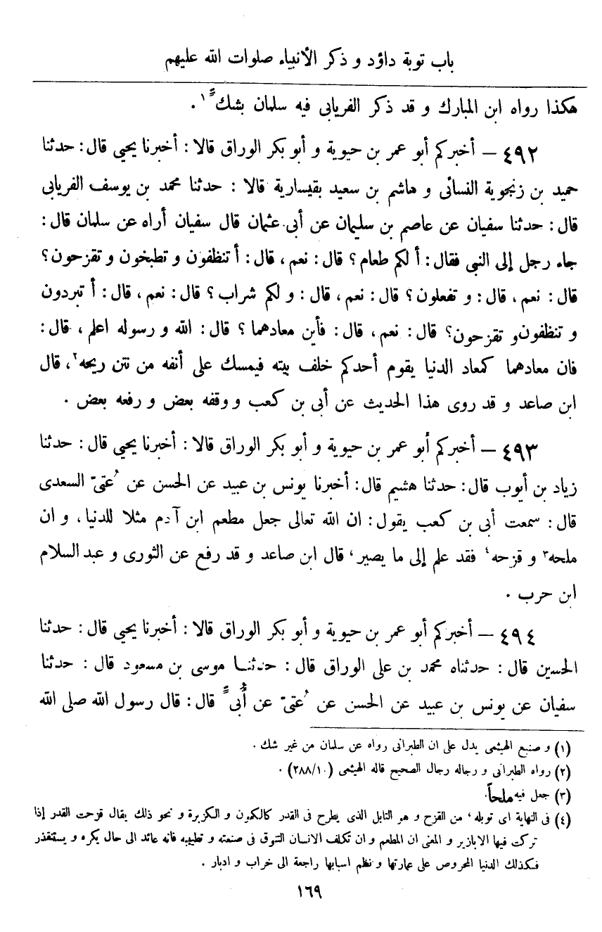٤٩٢ - أَخْبَرَكُمْ أَبُو عُمَرَ بْنُ حَيَوَيْهِ، وَأَبُو بَكْرٍ الْوَرَّاقُ قَالَا: أَخْبَرَنَا يَحْيَى، قَالَ: حَدَّثَنَا حُمَيْدُ بْنُ زَنْجُوَيْهِ النَّسَائِيُّ، وَهَاشِمُ بْنُ سَعِيدٍ بِقَيْسَارِيَةَ قَالَا: حَدَّثَنَا مُحَمَّدُ بْنُ يُوسُفَ الْفِرْيَابِيُّ قَالَ: حَدَّثَنَا سُفْيَانُ، عَنْ عَاصِمِ بْنِ سُلَيْمَانَ، عَنْ أَبِي عُثْمَانَ _ قَالَ: سُفْيَانُ أُرَاهُ عَنْ سَلْمَانَ، قَالَ: جَاءَ رَجُلٌ إِلَى النَّبِيِّ صَلَّى اللهُ عَلَيْهِ وَسَلَّمَ، فَقَالَ: «أَلَكُمْ طَعَامٌ؟» قَالَ: نَعَمْ، قَالَ: «أَتُنَظِّفُونَ وَتَطْبُخُونَ وَتُقَزِّحُونَ؟» قَالَ: نَعَمْ، قَالَ: «وَتَفْعَلُونَ؟» ، قَالَ: نَعَمْ، قَالَ: وَلَكُمْ شَرَابٌ؟ " قَالَ: نَعَمْ، قَالَ: «أَتُبَرِّدُونَ، وَتُنَظِّفُونَ، وَتُقَزِّحُونَ؟» قَالَ: نَعَمْ، قَالَ: «فَأَيْنَ مَعَادُهُمَا؟» قَالَ: اللَّهُ وَرَسُولُهُ أَعْلَمُ، قَالَ: «فَإِنَّ مَعَادَهُمَا كَمَعَادِ الدُّنْيَا، يَقُومُ أَحَدُكُمْ خَلْفَ بَيْتِهِ فَيُمْسِكُ عَلَى أَنْفِهِ مِنْ نَتَنِ رِيحِهِ» قَالَ ابْنُ صَاعِدٍ: «وَقَدْ رُوِيَ هَذَا الْحَدِيثُ عَنْ أُبَيِّ بْنِ كَعْبٍ وَوَقَفَهُ بَعْضٌ وَرَفَعَهُ بَعْضٌ»