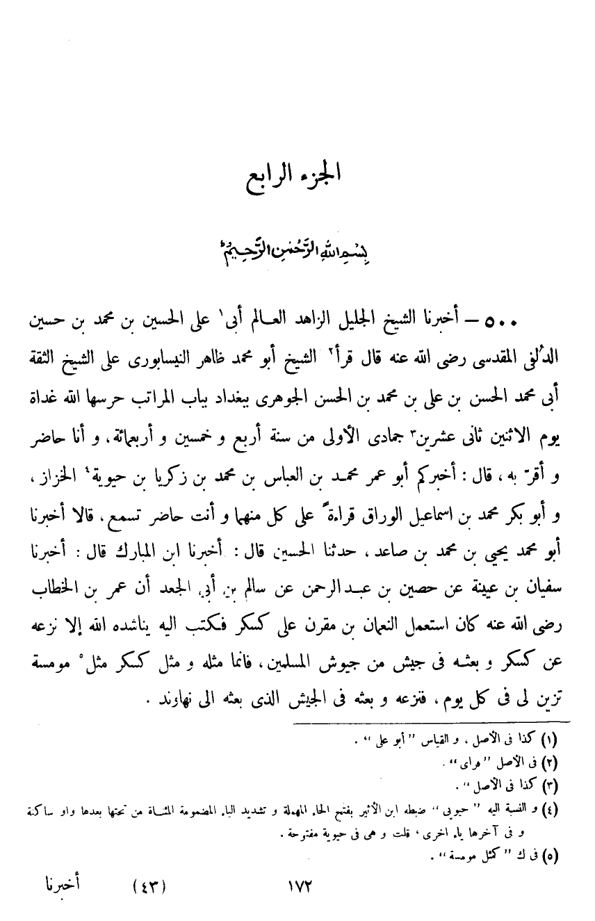 ٥٠٠ - أَخْبَرَنَا الشَّيْخُ الْجَلِيلُ الزَّاهِدُ الْعَالِمُ أَبُو عَلِيٍّ الْحُسَيْنُ بْنُ مُحَمَّدِ بْنِ الْحُسَيْنِ الدُّلَفِيُّ الْمَقْدِسِيُّ رَضِيَ اللَّهُ عَنْهُ قَالَ: قَرَأَ الشَّيْخُ أَبُو مُحَمَّدٍ ظَاهِرٌ النَّيْسَابُورِيُّ، عَلَى الشَّيْخِ الثِّقَةِ أَبِي مُحَمَّدٍ الْحَسَنِ بْنِ عَلِيِّ بْنِ مُحَمَّدِ بْنِ الْحَسَنِ الْجَوْهَرِيِّ بِبَغْدَادَ بِبَابِ الْمَرَاتِبِ حَرَسَهَا اللَّهُ غَدَاةَ يَوْمِ الْإِثْنَيْنِ ثَانِي عَشَرَ جُمَادَى الْأُولَى مِنْ سَنَةِ أَرْبَعٍ وَخَمْسِينَ وَأَرْبَعِمِائَةٍ، وَأَنَا حَاضِرٌ، وَأَقَرَّ بِهِ، قَالَ: أَخْبَرَكُمْ أَبُو عُمَرَ مُحَمَّدُ بْنُ الْعَبَّاسِ بْنِ مُحَمَّدِ بْنِ زَكَرِيَّا بْنِ حَيَوَيْهِ الْخَزَّازُ، وَأَبُو بَكْرٍ مُحَمَّدُ بْنُ إِسْمَاعِيلَ الْوَرَّاقُ قِرَاءَةً عَلَى كُلٍّ مِنْهُمَا وَأَنْتَ حَاضِرٌ تَسْمَعُ، قَالَا: أَخْبَرَنَا أَبُو مُحَمَّدٍ يَحْيَى بْنُ مُحَمَّدِ بْنِ صَاعِدٍ، حَدَّثَنَا الْحُسَيْنُ قَالَ: أَخْبَرَنَا ابْنُ الْمُبَارَكِ قَالَ: أَخْبَرَنَا سُفْيَانُ بْنُ عُيَيْنَةَ، عَنْ حُصَيْنِ بْنِ عَبْدِ الرَّحْمَنِ، عَنْ سَالِمِ بْنِ أَبِي الْجَعْدِ، أَنَّ عُمَرَ بْنَ الْخَطَّابِ، رَضِيَ اللَّهُ عَنْهُ، كَانَ اسْتَعْمَلَ النُّعْمَانَ بْنَ مُقَرِّنٍ عَلَى كَسْكَرَ، فَكَتَبَ إِلَيْهِ يُنَاشِدُهُ اللَّهَ إِلَّا نَزَعَهُ عَنْ كَسْكَرَ، وَبَعَثَهُ فِي جَيْشٍ مِنْ جُيُوشِ الْمُسْلِمِينَ، فَإِنَّمَا مَثَلُهُ مَثَلُ كَسْكَرَ مَثَلُ مُومِسَةٍ تَزَيَّنُ لِي فِي كُلَّ يَوْمٍ، فَنَزَعَهُ وَبَعَثَهُ فِي الْجَيْشِ الَّذِي بَعَثَهُ إِلَى نَهَاوَنْدَ "