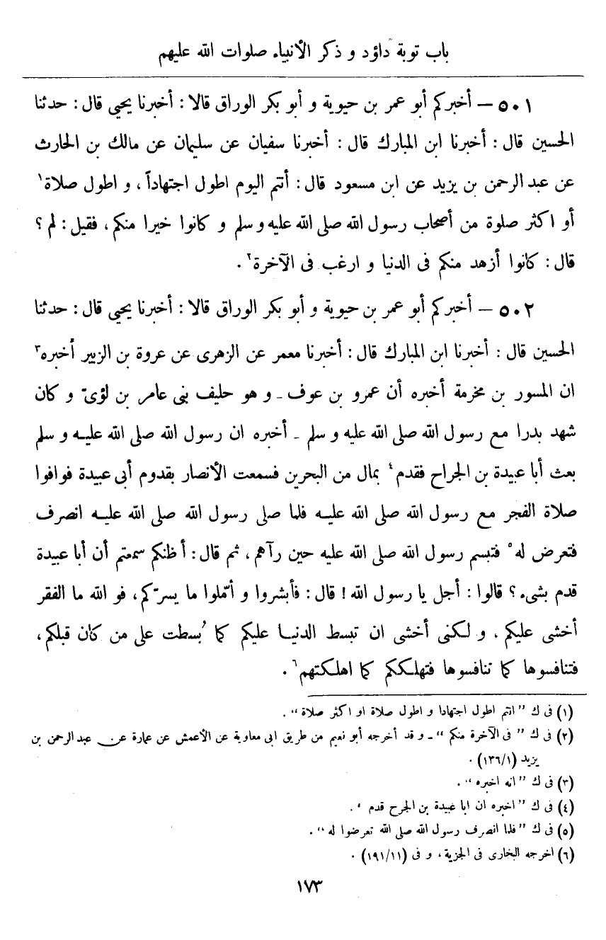 ٥٠٢ - أَخْبَرَكُمْ أَبُو عُمَرَ بْنُ حَيَوَيْهِ، وَأَبُو بَكْرٍ الْوَرَّاقُ قَالَا: أَخْبَرَنَا يَحْيَى قَالَ: حَدَّثَنَا الْحُسَيْنُ قَالَ: أَخْبَرَنَا ابْنُ الْمُبَارَكِ قَالَ: أَخْبَرَنَا مَعْمَرٌ، عَنِ الزُّهْرِيِّ، عَنْ عُرْوَةَ بْنِ الزُّبَيْرِ، أَخْبَرَهُ أَنَّ الْمِسْوَرِ بْنِ مَخْرَمَةَ، أَخْبَرَهُ أَنَّ عَمْرَو بْنَ عَوْفٍ، وَهُوَ حَلِيفُ بَنِي عَامِرِ بْنِ لُؤَيٍّ وَكَانَ شَهِدَ بَدْرًا مَعَ رَسُولِ اللَّهِ صَلَّى اللهُ عَلَيْهِ وَسَلَّمَ، أَخْبَرَهُ أَنَّ رَسُولَ اللَّهِ صَلَّى اللهُ عَلَيْهِ وَسَلَّمَ بَعَثَ أَبَا عُبَيْدَةَ بْنَ الْجَرَّاحِ فَقَدِمَ بِمَالٍ مِنَ الْبَحْرَيْنِ، فَسَمِعَتِ الْأَنْصَارُ بِقُدُومِ أَبِي عُبَيْدَةَ، فَوَافَوْا صَلَاةَ الْفَجْرِ مَعَ رَسُولِ اللَّهِ صَلَّى اللهُ عَلَيْهِ وَسَلَّمَ، فَلَمَّا صَلَّى رَسُولُ اللَّهِ صَلَّى عَلَيْهِ وَسَلَّمَ انْصَرَفَ، فَتَعَرَّضُوا لَهُ، فَتَبَسَّمَ رَسُولُ اللَّهِ صَلَّى اللهُ عَلَيْهِ وَسَلَّمَ حِينَ رَآهُمْ، ثُمَّ قَالَ: «أَظُنُّكُمْ سَمِعْتُمْ أَنَّ أَبَا عُبَيْدَةَ قَدِمَ بِشَيْءٍ؟» قَالُوا: أَجَلْ يَا رَسُولَ اللَّهِ، قَالَ: «فَأَبْشِرُوا وَأَمِّلُوا مَا يَسُرُّكُمْ، فَوَاللَّهِ مَا الْفَقْرَ أَخْشَى عَلَيْكُمْ، وَلَكِنِّي أَخْشَى أَنْ تُبْسَطَ الدُّنْيَا عَلَيْكُمْ كَمَا بُسِطَتْ عَلَى مَنْ كَانَ قَبْلَكُمْ، فَتَنَافَسُوهَا كَمَا تَنَافَسُوهَا فَتُهْلِكَكُمْ كَمَا أَهْلَكَتْهُمْ»