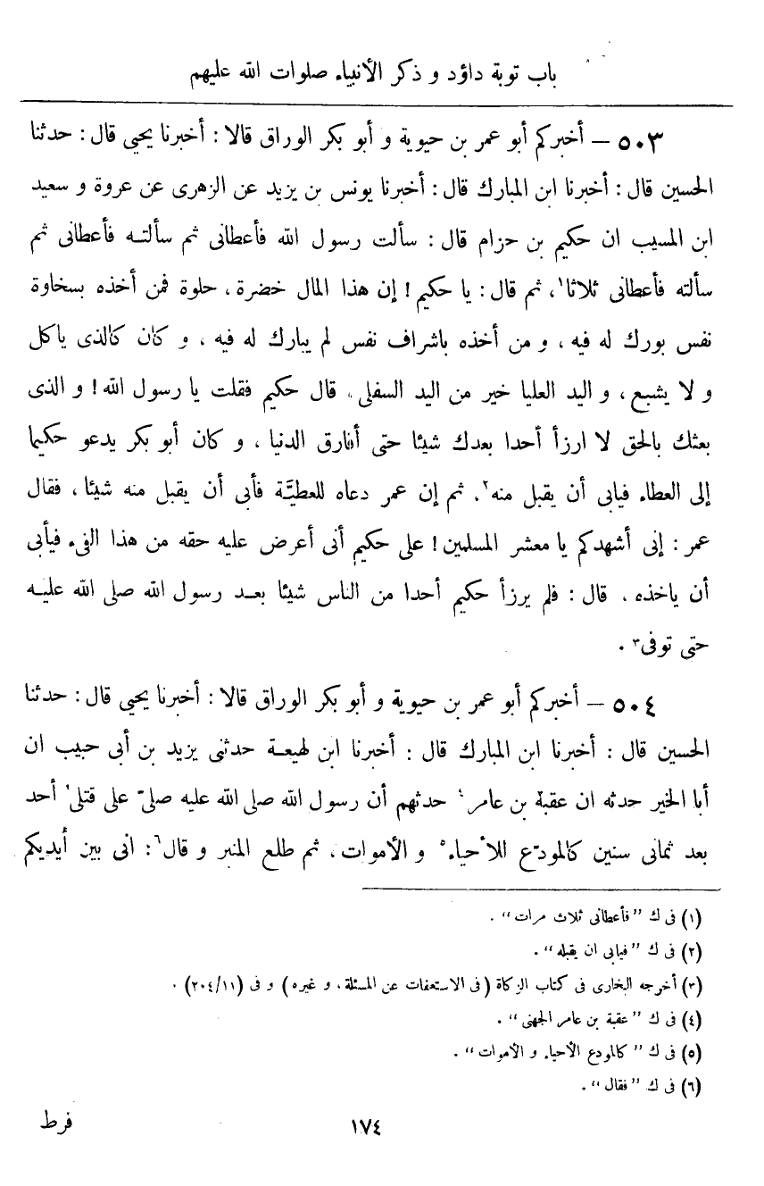 ٥٠٣ - أَخْبَرَكُمْ أَبُو عُمَرَ بْنُ حَيَوَيْهِ، وَأَبُو بَكْرٍ الْوَرَّاقُ قَالَا: أَخْبَرَنَا يَحْيَى قَالَ: حَدَّثَنَا الْحُسَيْنُ قَالَ: أَخْبَرَنَا ابْنُ الْمُبَارَكِ قَالَ: أَخْبَرَنَا يُونُسُ بْنُ يَزِيدَ، عَنِ الزُّهْرِيِّ، عَنْ عُرْوَةَ، وَسَعِيدِ بْنِ الْمُسَيِّبِ، أَنَّ حَكِيمَ بْنَ حِزَامٍ قَالَ: سَأَلْتُ رَسُولَ اللَّهِ فَأَعْطَانِي، ثُمَّ سَأَلْتُهُ فَأَعْطَانِي، ثُمَّ سَأَلْتُهُ فَأَعْطَانِي، ثَلَاثًا، ثُمَّ قَالَ: «يَا حَكِيمُ، إِنَّ هَذَا الْمَالَ خَضِرَةٌ حُلْوَةٌ، فَمَنْ أَخَذَهُ بِسَخَاوَةِ نَفْسٍ بُورِكَ لَهُ فِيهِ، وَمَنْ أَخَذَهُ بإِشَرَافِ نَفْسٍ لَمْ يُبَارَكْ لَهُ فِيهِ، وَكَانَ كَالَّذِي يَأْكُلُ وَلَا يَشْبَعُ، وَالْيَدُ الْعُلْيَا خَيْرٌ مِنَ الْيَدِ السُّفْلَى» ، قَالَ حَكِيمٌ: فَقُلْتُ: يَا رَسُولَ اللَّهِ، وَالَّذِي بَعَثَكَ بِالْحَقِّ لَا أَرْزَأُ أَحَدًا بَعْدَكَ شَيْئًا حَتَّى أُفَارِقَ الدُّنْيَا وَكَانَ أَبُو بَكْرٍ يَدْعُو حَكِيمًا إِلَى الْعَطَاءِ فَيَأْبَى أَنْ يَقْبَلَ مِنْهُ، ثُمَّ إِنَّ عُمَرَ دَعَاهُ لِلْعَطِيَّةِ فَأَبَى أَنْ يَقْبَلَ مِنْهُ شَيْئًا، فَقَالَ عُمَرُ: إِنِّي أُشْهِدُكُمْ يَا مَعْشَرَ الْمُسْلِمِينَ عَلَى حَكِيمٍ، أَنِّي أَعْرِضُ عَلَيْهِ حَقَّهُ مِنْ هَذَا الْفَيْءِ فَيَأْبَى أَنْ يَأْخُذَهُ، قَالَ: فَلَمْ يَرْزَأْ حَكِيمٌ أَحَدًا مِنَ النَّاسِ شَيْئًا بَعْدَ رَسُولِ اللَّهِ صَلَّى اللهُ عَلَيْهِ وَسَلَّمَ حَتَّى تُوُفِّيَ "