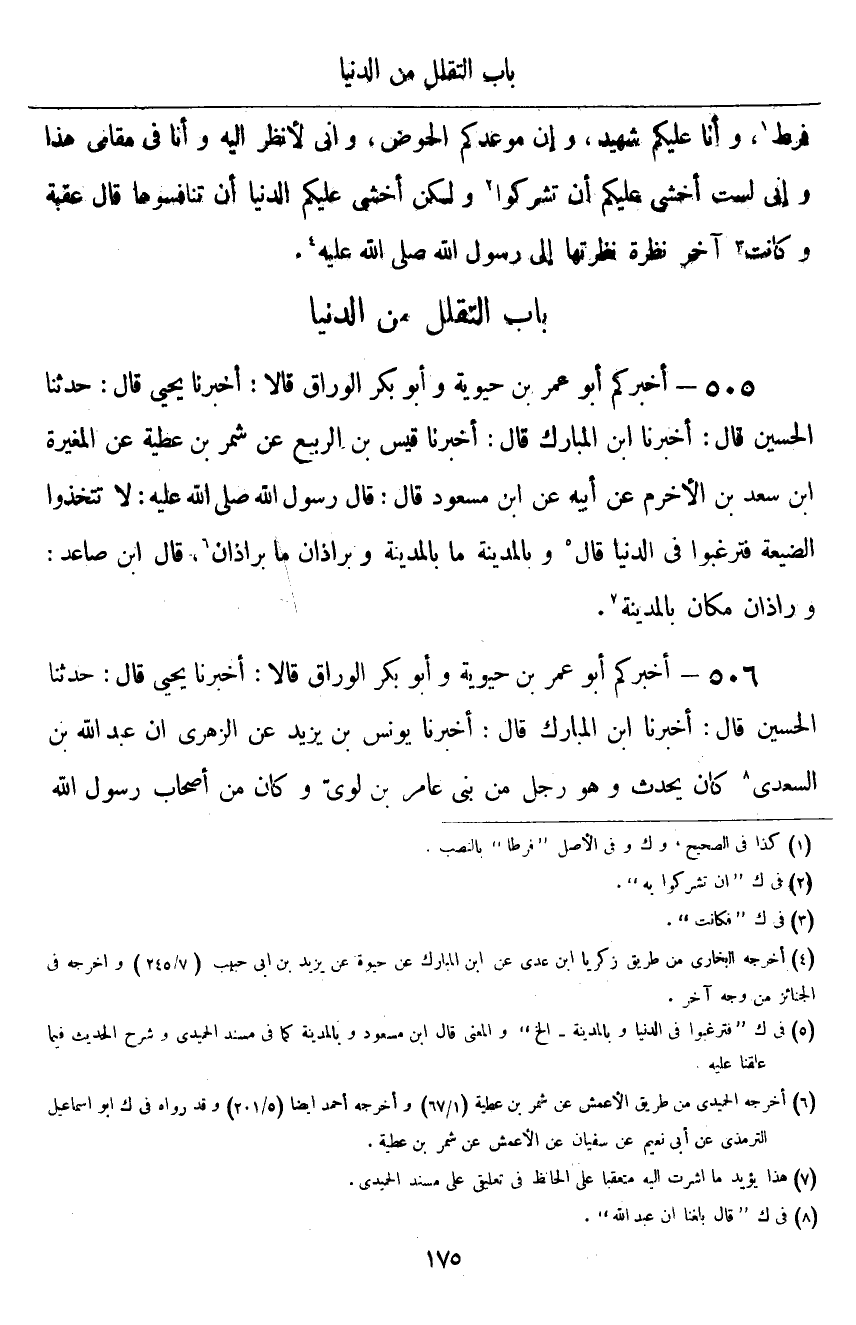 ٥٠٥ - أَخْبَرَكُمْ أَبُو عُمَرَ بْنُ حَيَوَيْهِ، وَأَبُو بَكْرٍ الْوَرَّاقُ قَالَا: أَخْبَرَنَا يَحْيَى قَالَ: حَدَّثَنَا الْحُسَيْنُ قَالَ: أَخْبَرَنَا ابْنُ الْمُبَارَكِ قَالَ: أَخْبَرَنَا قَيْسُ بْنُ الرَّبِيعِ، عَنْ شِمْرِ بْنِ عَطِيَّةَ، عَنِ الْمُغِيرَةِ بْنِ سَعْدِ بْنِ الْأَخْرَمِ، عَنْ أَبِيهِ، عَنِ ابْنِ مَسْعُودٍ قَالَ: قَالَ رَسُولُ اللَّهِ صَلَّى عَلَيْهِ وَسَلَّمَ: «لَا تَتَّخِذُوا الضَّيْعَةَ؛ فَتَرْغَبُوا فِي الدُّنْيَا» ، قَالَ: وَبِالْمَدِينَةِ: مَا بِالْمَدِينَةِ، وَبِرَاذَانَ مَا بِرَاذَانُ. قَالَ ابْنُ صَاعِدٍ: وَرَاذَانُ مَكَانٌ بِالْمَدِينَةِ