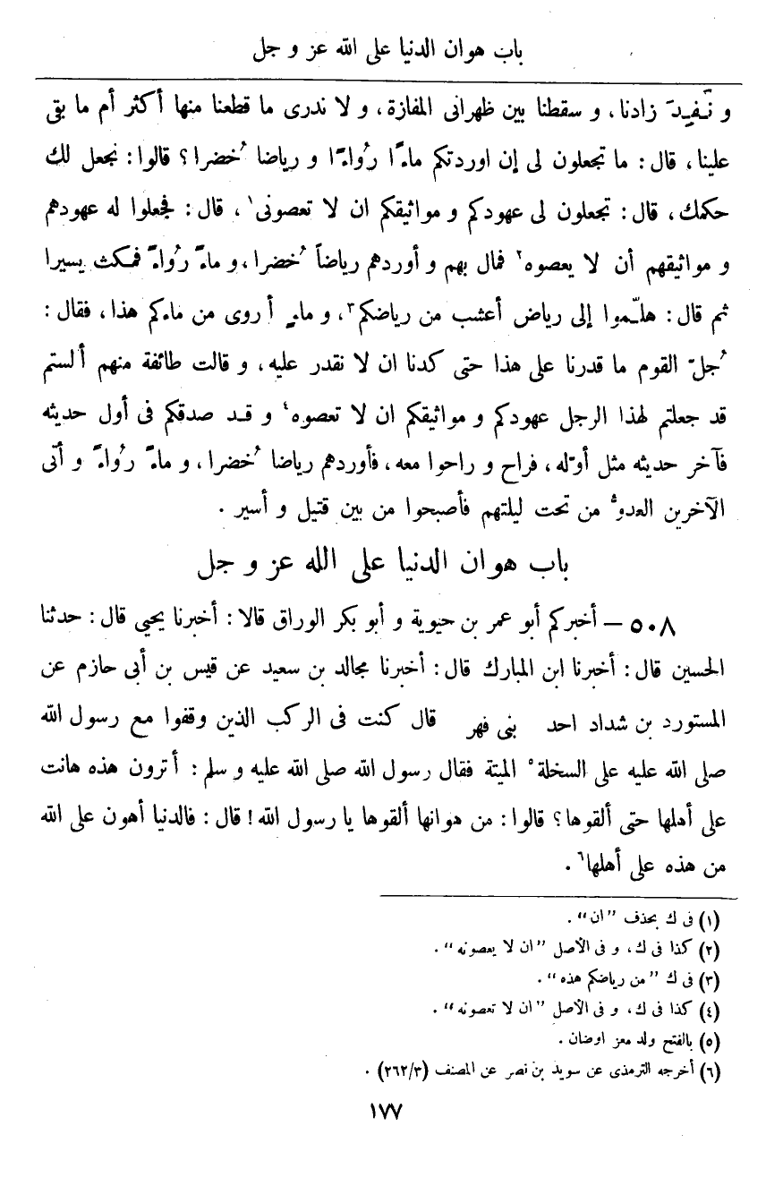 ٥٠٨ - أَخْبَرَكُمْ أَبُو عُمَرَ بْنُ حَيَوَيْهِ، وَأَبُو بَكْرٍ الْوَرَّاقُ قَالَا: أَخْبَرَنَا يَحْيَى قَالَ: حَدَّثَنَا الْحُسَيْنُ قَالَ: أَخْبَرَنَا ابْنُ الْمُبَارَكِ قَالَ: أَخْبَرَنَا مُجَالِدُ بْنُ سَعِيدٍ، عَنْ قَيْسِ بْنِ أَبِي حَازِمٍ، عَنِ الْمُسْتَوْرِدِ بْنِ شَدَّادٍ - أَحَدِ بَنِي فِهْرٍ - قَالَ: كُنْتُ فِي الرَّكْبِ الَّذِينَ وَقَفُوا مَعَ رَسُولِ اللَّهِ صَلَّى اللَّهُ عَلَيْهِ عَلَى السَّخْلَةِ الْمَيِّتَةِ، فَقَالَ رَسُولُ اللَّهِ صَلَّى اللهُ عَلَيْهِ وَسَلَّمَ: «أَتَرَوْنَ هَذِهِ هَانَتْ عَلَى أَهْلِهَا حَتَّى أَلْقَوْهَا؟» قَالُوا: مِنْ هَوَانِهَا أَلْقَوْهَا يَا رَسُولَ اللَّهِ، قَالَ: «فَالدُّنْيَا أَهْوَنُ عَلَى اللَّهِ مِنْ هَذِهِ عَلَى أَهْلِهَا»