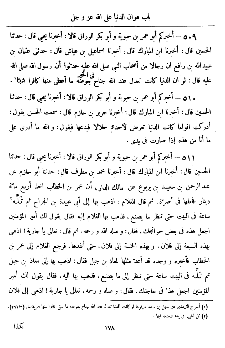 ٥٠٩ - أَخْبَرَكُمْ أَبُو عُمَرَ بْنُ حَيَوَيْهِ، وَأَبُو بَكْرٍ الْوَرَّاقُ قَالَا: أَخْبَرَنَا يَحْيَى قَالَ: حَدَّثَنَا الْحُسَيْنُ قَالَ: أَخْبَرَنَا ابْنُ الْمُبَارَكِ قَالَ: أَخْبَرَنَا إِسْمَاعِيلُ بْنُ عَيَّاشٍ قَالَ: حَدَّثَنِي عُثْمَانُ بْنُ عُبَيْدِ اللَّهِ بْنِ أَبِي رَافِعٍ أَنَّ رِجَالًا مِنْ أَصْحَابِ النَّبِيِّ صَلَّى اللهُ عَلَيْهِ وَسَلَّمَ حَدَّثُوا أَنَّ رَسُولَ اللَّهِ صَلَّى اللَّهُ عَلَيْهِ قَالَ: «لَوْ أَنَّ الدُّنْيَا تَعْدِلُ عِنْدَ اللَّهِ جَنَاحَ بَعُوضَةٍ فِي الْخَيْرِ مَا أَعْطَى مِنْهَا الْكَافِرَ شَيْئًا»