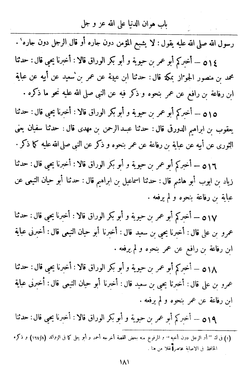 ٥١٩ - أَخْبَرَكُمْ أَبُو عُمَرَ بْنُ حَيَوَيْهِ، وَأَبُو بَكْرٍ الْوَرَّاقُ قَالَا: أَخْبَرَنَا يَحْيَى قَالَ: حَدَّثَنَا ⦗١٨٢⦘ الْحُسَيْنُ قَالَ: أَخْبَرَنَا ابْنُ الْمُبَارَكِ قَالَ: أَخْبَرَنَا يُونُسُ بْنُ يَزِيدَ، عَنِ الزُّهْرِيِّ قَالَ: أَخْبَرَنِي إِبْرَاهِيمُ بْنُ عَبْدِ الرَّحْمَنِ بْنِ عَوْفٍ أَنَّهُ قَدِمَ وَافِدًا عَلَى مُعَاوِيَةَ فِي خِلَافَتِهِ، فَقَالَ: فَدَخَلْتُ الْمَقْصُورَةَ، فَسَلَّمْتُ عَلَى مَجْلِسٍ مِنْ أَهْلِ الشَّامِ، ثُمَّ جَلَسْتُ، فَقَالَ لِي رَجُلٌ مِنْهُمْ: مَنْ أَنْتَ يَا فَتَى؟ قُلْتُ: أَنَا إِبْرَاهِيمُ بْنُ عَبْدِ الرَّحْمَنِ بْنِ عَوْفٍ، قَالَ: يَرْحَمُ اللَّهُ أَبَاكَ، أَخْبَرَنِي فُلَانٌ - لِرَجُلٍ سَمَّاهُ - أَنَّهُ قَالَ: " وَاللَّهِ لَأَلْحَقَنَّ بِأَصْحَابِ رَسُولِ اللَّهِ صَلَّى اللهُ عَلَيْهِ وَسَلَّمَ، فَلَأُحْدِثَنَّ بِهِمْ عَهْدًا، وَلَا أُكَلِّمَنَّهُمْ، قَالَ: فَقَدِمْتُ الْمَدِينَةَ فِي خِلَافَةِ عُثْمَانَ بْنِ عَفَّانَ؛ فَلَقِيتُهُمْ إِلَّا عَبْدَ الرَّحْمَنِ بْنَ عَوْفٍ، أُخْبِرْتُ أَنَّهُ بِأَرْضٍ لَهُ بِالْجُرُفِ، فَرَكِبْتُ إِلَيْهِ حَتَّى جِئْتُهُ، فَإِذَا هُوَ وَاضِعٌ رِدَاءَهُ يُحَوِّلُ الْمَاءَ بِمِسْحَاةٍ فِي يَدِهِ، فَلَمَّا رَآنِي اسْتَحْيَى مِنِّي فَأَلْقَى الْمِسْحَاةَ، وَأَخَذَ رِدَاءَهُ، فَسَلَّمْتُ عَلَيْهِ، وَقُلْتُ لَهُ: جِئْتُكَ لِأَمْرٍ، وَقَدْ رَأَيْتُ أَعْجَبَ مِنْهُ، هَلْ جَاءَكُمْ إِلَّا مَا جَاءَنَا؟ وَهَلْ عَلِمْتُمْ إِلَّا مَا عَلِمْنَا؟ فَقَالَ: عَبْدُ الرَّحْمَنِ: لَمْ يَأْتِنَا إِلَّا مَا قَدْ جَاءَكُمْ، وَلَمْ نَعْلَمْ إِلَّا مَا قَدْ عَلِمْتُمْ، قُلْتُ: فَمَا زِلْنَا نَزْهَدُ فِي الدُّنْيَا وَتَرْغَبُونَ، وَنَخِفُّ فِي الْجِهَادِ وَتَتَثَاقَلُونَ، وَأَنْتُمْ سَلَفُنَا، وَخِيَارُنَا، وَأَصْحَابُ نَبِيِّنَا صَلَّى اللهُ عَلَيْهِ وَسَلَّمَ، فَقَالَ عَبْدُ الرَّحْمَنِ: لَمْ يَأْتِنَا إِلَّا مَا قَدْ جَاءَكُمْ، وَلَمْ نَعْلَمْ إِلَّا مَا قَدْ عَلِمْتُمْ، وَلَكِنَّا بُلِينَا بِالضَّرَّاءِ فَصَبَرْنَا، وَبُلِينَا بِالسَّرَّاءِ فَلَمْ نَصْبِرْ "