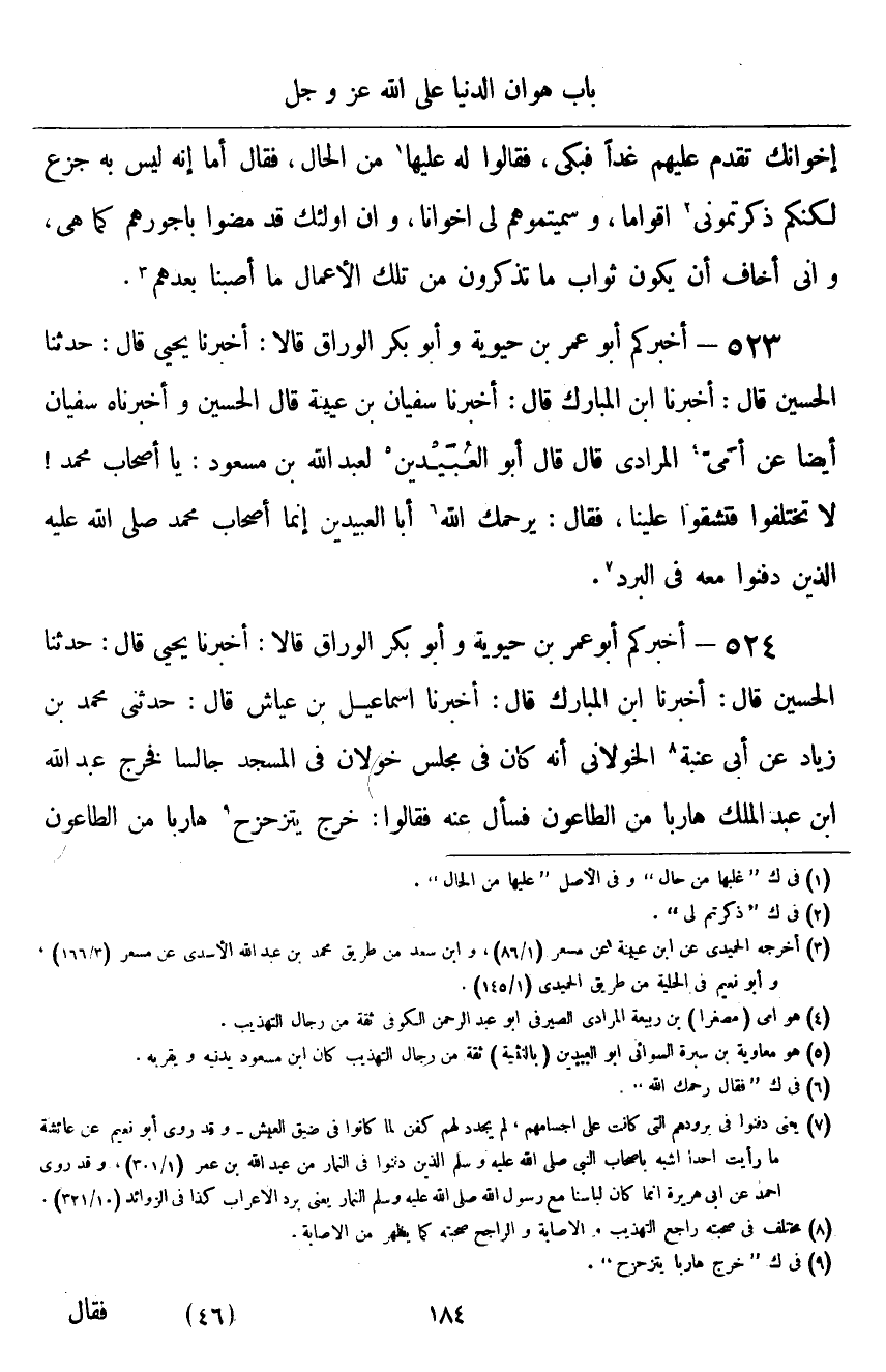 ٥٢٣ - أَخْبَرَكُمْ أَبُو عُمَرَ بْنُ حَيَوَيْهِ، وَأَبُو بَكْرٍ الْوَرَّاقُ قَالَا: أَخْبَرَنَا يَحْيَى قَالَ: حَدَّثَنَا الْحُسَيْنُ قَالَ: أَخْبَرَنَا ابْنُ الْمُبَارَكِ قَالَ: أَخْبَرَنَا سُفْيَانُ بْنُ عُيَيْنَةَ: قَالَ الْحُسَيْنُ، وَأَخْبَرَنَاهُ سُفْيَانُ أَيْضًا، عَنْ أُمَيٍّ الْمُرَادِيِّ قَالَ: قَالَ أَبُو الْعُبَيْدَيْنِ لِعَبْدِ اللَّهِ بْنِ مَسْعُودٍ: " يَا أَصْحَابَ مُحَمَّدٍ، لَا تَخْتَلِفُوا فَتَشُقُّوا عَلَيْنَا، فَقَالَ: يَرْحَمُكَ اللَّهُ أَبَا الْعُبَيْدَيْنِ، إِنَّمَا أَصْحَابُ مُحَمَّدٍ صَلَّى اللهُ عَلَيْهِ وَسَلَّمَ الَّذِينَ دُفِنُوا مَعَهُ فِي الْبُرُدِ "