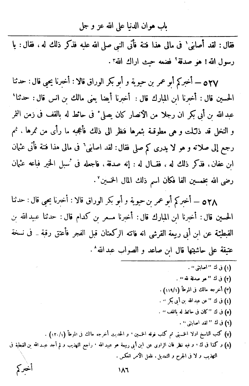 ٥٢٧ - أَخْبَرَكُمْ أَبُو عُمَرَ بْنُ حَيَوَيْهِ، وَأَبُو بَكْرٍ الْوَرَّاقُ قَالَا: أَخْبَرَنَا يَحْيَى قَالَ: حَدَّثَنَا الْحُسَيْنُ قَالَ: أَخْبَرَنَا ابْنُ الْمُبَارَكِ قَالَ: أَخْبَرَنَا أَيْضًا - يَعْنِي مَالِكَ بْنَ أَنَسٍ - قَالَ: حَدَّثَنَا عَبْدُ اللَّهِ بْنُ أَبِي بَكْرٍ " أَنَّ رَجُلًا مِنَ الْأَنْصَارِ كَانَ يُصَلِّي فِي حَائِطٍ لَهُ بِالْقُفِّ فِي زَمَنِ الثَّمَرِ، وَالنَّخْلُ قَدْ ذُلِّلَتْ، وَهِيَ مُطَوِّقَةٌ بِثَمَرِهَا، فَنَظَرَ إِلَى ذَلِكَ فَأَعْجَبَهُ مَا رَأَى مِنْ ثَمَرِهَا، ثُمَّ رَجَعَ إِلَى صَلَاتِهِ وَهُوَ لَا يَدْرِي كَمْ صَلَّى، فَقَالَ: لَقَدْ أَصَابَنِي فِي مَالِي هَذَا فِتْنَةٌ، فَأَتَى عُثْمَانَ بْنَ عَفَّانَ فَذَكَرَ لَهُ، فَقَالَ لَهُ: إِنَّهُ صَدَقَةٌ، فَاجْعَلْهُ فِي سُبُلِ الْخَيْرِ، فَبَاعَهُ عُثْمَانَ رَضِيَ اللَّهُ عَنْهُ بِخَمْسِينَ أَلْفًا، فَكَانَ اسْمُ ذَلِكَ الْمَالِ الْخَمْسِينَ "
