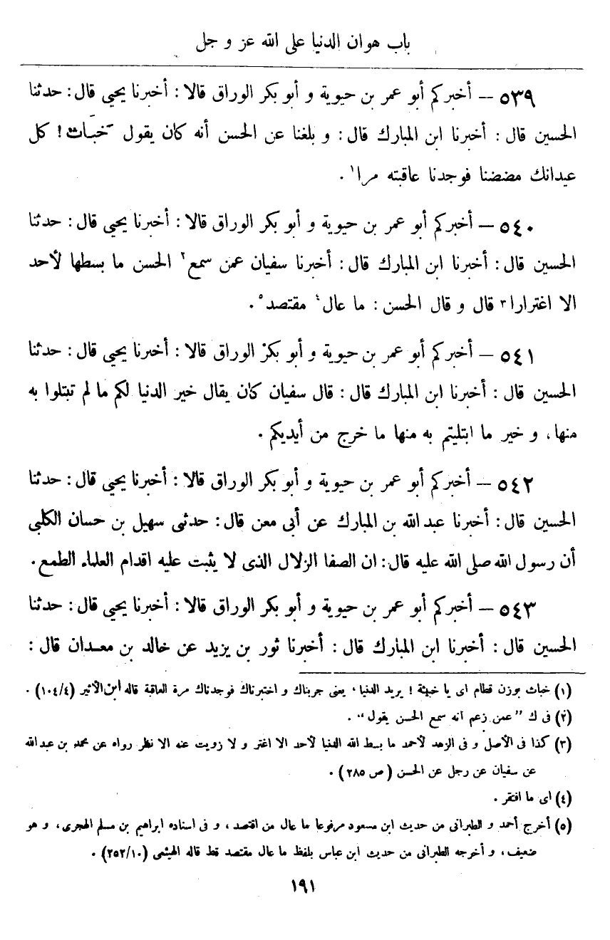 ٥٣٩ - أَخْبَرَكُمْ أَبُو عُمَرَ بْنُ حَيَوَيْهِ، وَأَبُو بَكْرٍ الْوَرَّاقُ قَالَا: أَخْبَرَنَا يَحْيَى قَالَ: حَدَّثَنَا الْحُسَيْنُ قَالَ: أَخْبَرَنَا ابْنُ الْمُبَارَكِ قَالَ: وَبَلَغَنَا عَنِ الْحَسَنِ أَنَّهُ كَانَ يَقُولُ: «خَبَاثُ، كُلُّ عِيدَانِكَ مَضَضْنَا، فَوَجَدْنَا عَاقِبَتَهُ مُرًّا»