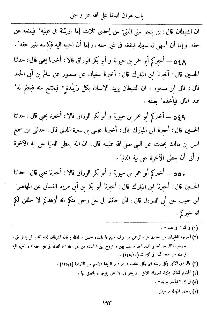 ٥٤٨ - أَخْبَرَكُمْ أَبُو عُمَرَ بْنُ حَيَوَيْهِ، وَأَبُو بَكْرٍ الْوَرَّاقُ قَالَا: أَخْبَرَنَا يَحْيَى قَالَ: حَدَّثَنَا الْحُسَيْنُ قَالَ: أَخْبَرَنَا ابْنُ الْمُبَارَكِ قَالَ: أَخْبَرَنَا سُفْيَانُ، عَنْ مَنْصُورٍ، عَنْ سَالِمِ بْنِ أَبِي الْجَعْدِ قَالَ: قَالَ ابْنُ مَسْعُودٍ: «إِنَّ الشَّيْطَانَ يُرِيدُ الْإِنْسَانِ بِكُلِّ رَيْدَةٍ، فَيَمْتَنِعُ مِنْهُ، فَيَجْثُمُ لَهُ عِنْدَ الْمَالِ، فَيَأْخُذُهُ بِعُنُقِهِ»
