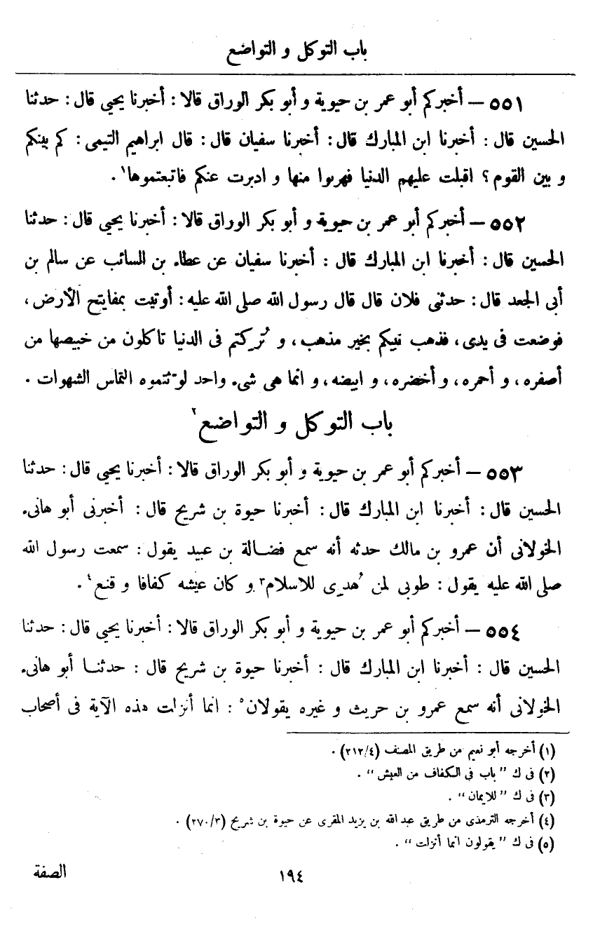أَخْبَرَكُمْ أَبُو عُمَرَ بْنُ حَيَوَيْهِ، وَأَبُو بَكْرٍ الْوَرَّاقُ قَالَا: أَخْبَرَنَا يَحْيَى قَالَ: حَدَّثَنَا الْحُسَيْنُ قَالَ: أَخْبَرَنَا ابْنُ الْمُبَارَكِ قَالَ: أَخْبَرَنَا حَيْوَةُ بْنُ شُرَيْحٍ قَالَ: أَخْبَرَنِي أَبُو هَانِئٍ الْخَوْلَانِيُّ أَنَّ عَمْرَو بْنَ مَالِكٍ حَدَّثَهُ أَنَّهُ سَمِعَ فَضَالَةَ بْنَ عُبَيْدٍ يَقُولُ: سَمِعْتُ رَسُولَ اللَّهِ صَلَّى اللهُ عَلَيْهِ وَسَلَّمَ يَقُولُ: «طُوبَى لِمَنْ هُدِيَ لِلْإَسْلَامِ، وَكَانَ عَيْشُهُ كَفَافًا، وَقَنَعَ»