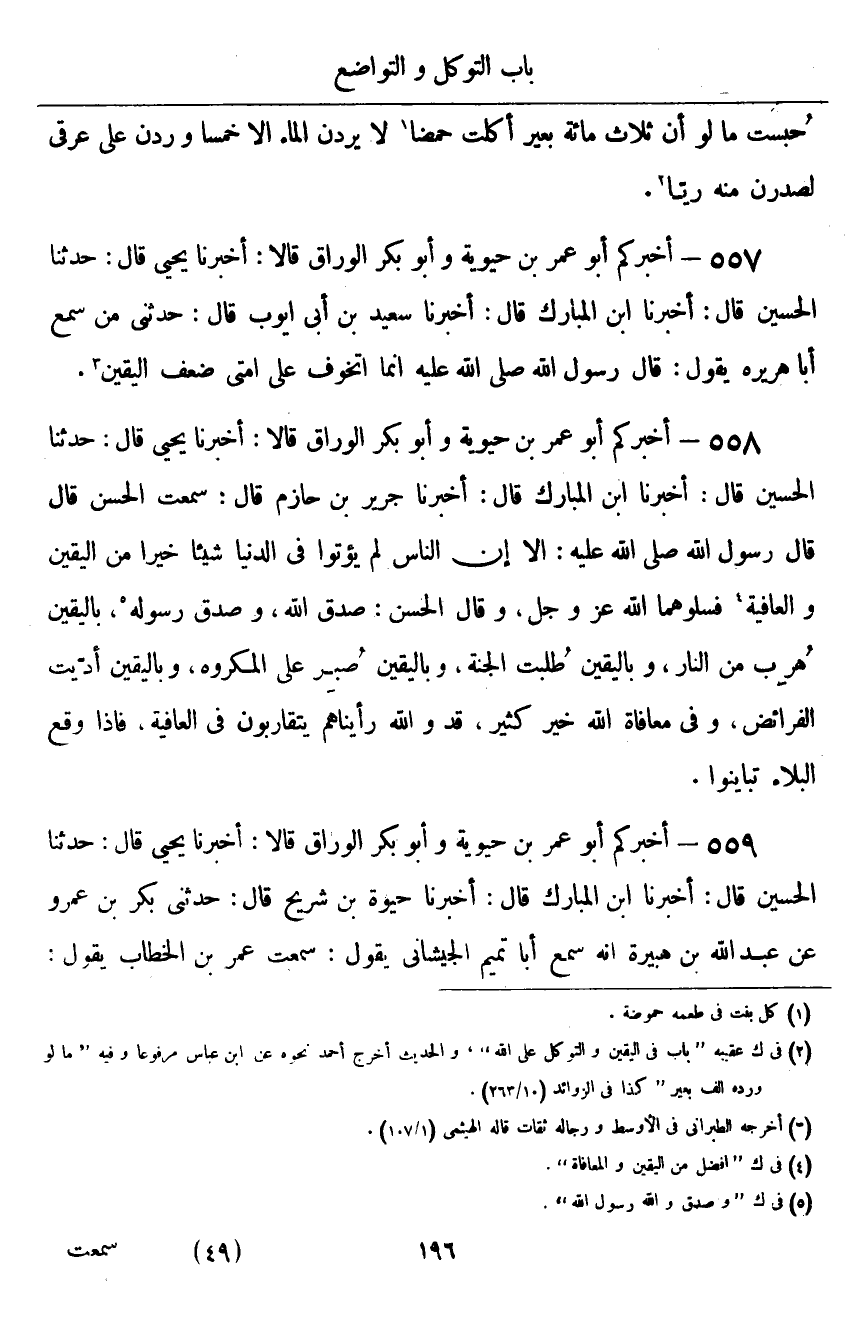 ٥٥٧ - أَخْبَرَكُمْ أَبُو عُمَرَ بْنُ حَيَوَيْهِ، وَأَبُو بَكْرٍ الْوَرَّاقُ قَالَا: أَخْبَرَنَا يَحْيَى قَالَ: حَدَّثَنَا الْحُسَيْنُ قَالَ: أَخْبَرَنَا ابْنُ الْمُبَارَكِ قَالَ: أَخْبَرَنَا سَعِيدُ بْنُ أَبِي أَيُّوبَ قَالَ: حَدَّثَنِي مَنْ سَمِعَ أَبَا هُرَيْرَةَ يَقُولُ: قَالَ رَسُولُ اللَّهِ صَلَّى اللهُ عَلَيْهِ وَسَلَّمَ: «إِنَّمَا أَتَخَوَّفُ عَلَى أُمَّتِي ضَعْفَ الْيَقِينِ»