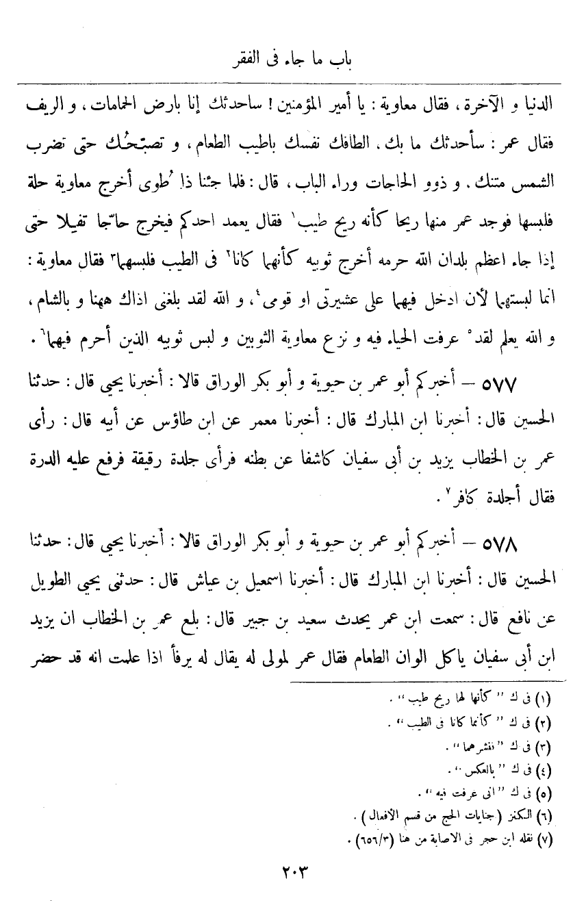 ٥٧٧ - أَخْبَرَكُمْ أَبُو عُمَرَ بْنُ حَيَوَيْهِ، وَأَبُو بَكْرٍ الْوَرَّاقُ قَالَا: أَخْبَرَنَا يَحْيَى قَالَ: حَدَّثَنَا الْحُسَيْنُ قَالَ: أَخْبَرَنَا ابْنُ الْمُبَارَكِ قَالَ: أَخْبَرَنَا مَعْمَرٌ، عَنِ ابْنِ طَاوُسٍ، عَنْ أَبِيهِ قَالَ: رَأَى عُمَرُ بْنُ الْخَطَّابِ يَزِيدَ بْنَ أَبِي سُفْيَانَ كَاشِفًا عَنْ بَطْنِهِ، فَرَأَى جِلْدَةً رَقِيقَةً، فَرَفَعَ عَلَيْهِ الدِّرَّةَ، فَقَالَ: «أَجِلْدَةُ كَافِرٍ»