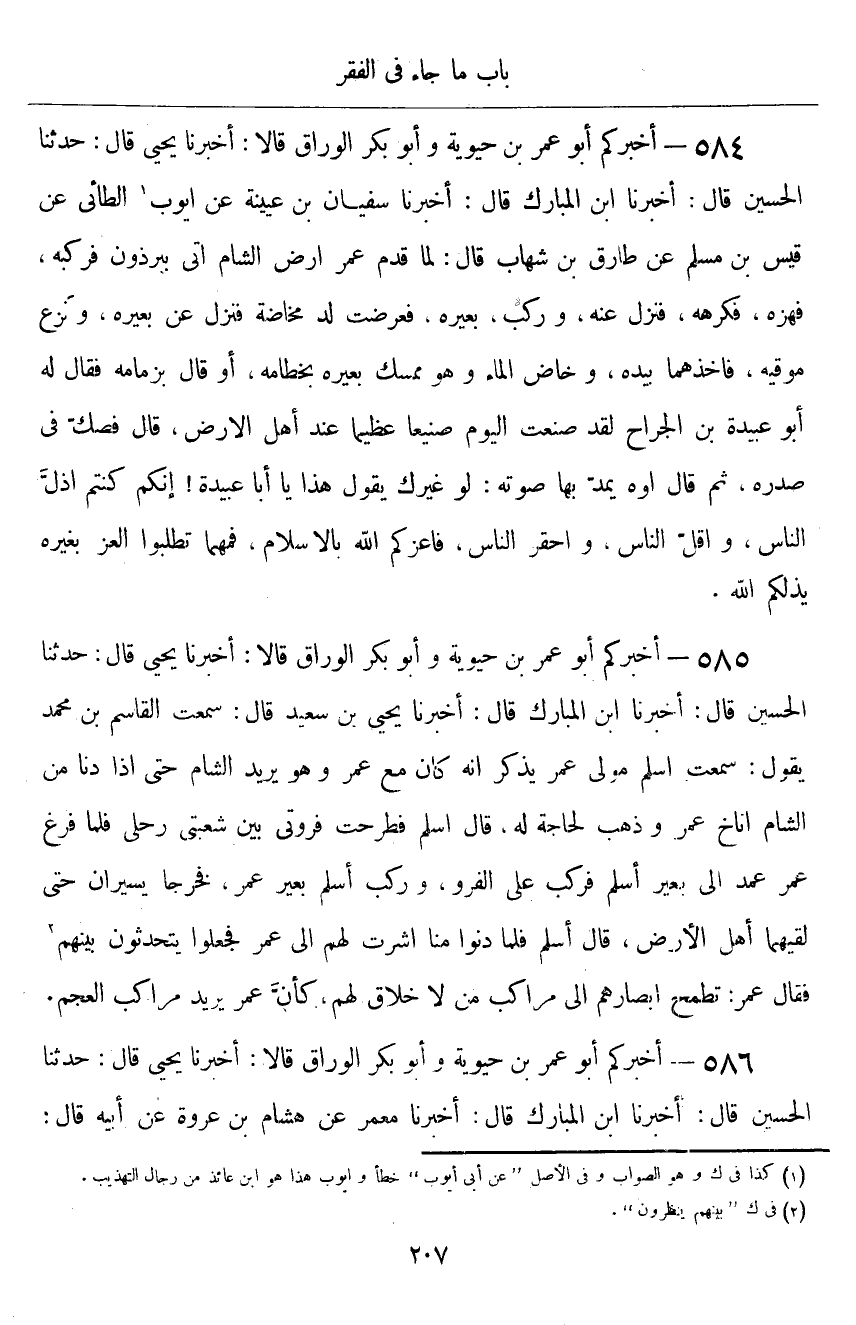 ٥٨٤ - أَخْبَرَكُمْ أَبُو عُمَرَ بْنُ حَيَوَيْهِ، وَأَبُو بَكْرٍ الْوَرَّاقُ قَالَا: أَخْبَرَنَا يَحْيَى قَالَ: حَدَّثَنَا الْحُسَيْنُ قَالَ: أَخْبَرَنَا ابْنُ الْمُبَارَكِ قَالَ: أَخْبَرَنَا سُفْيَانُ بْنُ عُيَيْنَةَ، عَنْ أَيُّوبَ الطَّائِيِّ، عَنْ قَيْسِ بْنِ مُسْلِمٍ، عَنْ طَارِقِ بْنِ شِهَابٍ قَالَ: لَمَّا قَدِمَ عُمَرُ أَرْضَ الشَّامِ أُتِيَ بِبِرْذَونٍ فَرَكِبَهُ، فَهَزَّهُ، فَكَرِهَهُ، فَنَزَلَ عَنْهُ، وَرَكِبَ بَعِيرَهُ، فَعَرَضَتْ لَهُ مَخَاضَةٌ، فَنَزَلَ عَنْ بَعِيرِهِ، وَنَزَعَ مُوقَيْهِ، فَأَخَذَهُمَا بِيَدِهِ، وَخَاضَ الْمَاءَ، وَهُوَ مُمْسِكٌ بَعِيرَهُ بِخِطَامِهِ - أَوْ قَالَ: بِزِمَامِهِ - فَقَالَ لَهُ أَبُو عُبَيْدَةَ بْنُ الْجَرَّاحِ: لَقَدْ صَنَعْتَ الْيَوْمَ صَنِيعًا عَظِيمًا عِنْدَ أَهْلِ الْأَرْضِ، قَالَ: فَصَكَّ فِي صَدْرِهِ، ثُمَّ قَالَ: «أَوِّهْ - يَمُدُّ بِهَا صَوْتَهُ - لَوْ غَيْرُكَ يَقُولُ هَذَا يَا أَبَا عُبَيْدَةَ، إِنَّكُمْ كُنْتُمْ أَذَلَّ النَّاسِ، وَأَقَلَّ النَّاسِ، وَأَحْقَرَ النَّاسِ، فَأَعَزَّكُمُ اللَّهُ بِالْإِسْلَامِ، فَمَهْمَا تَطْلُبُوا الْعِزَّ بِغَيْرِهِ يُذِلَّكُمُ اللَّهُ»