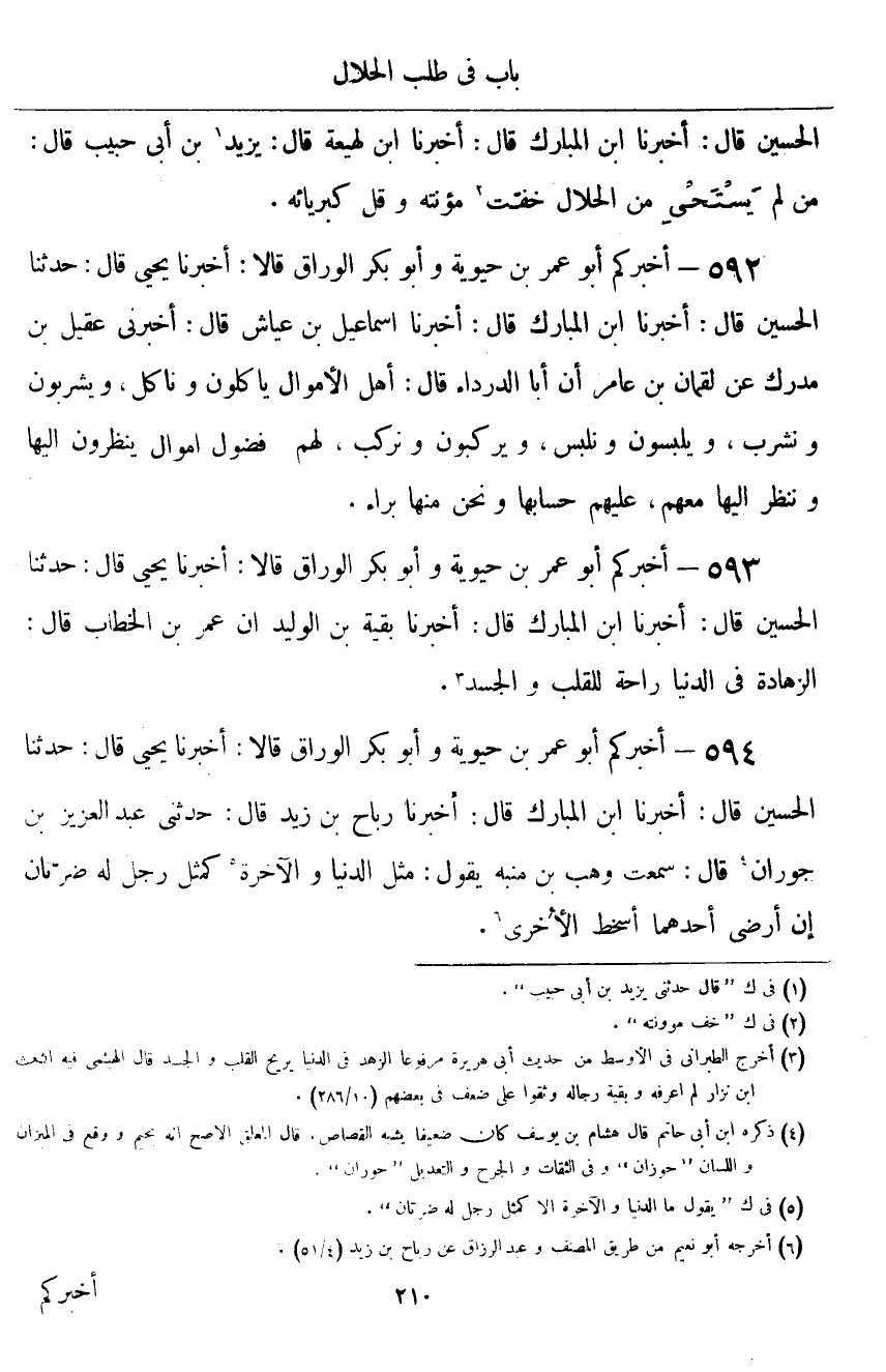 ٥٩٢ - أَخْبَرَكُمْ أَبُو عُمَرَ بْنُ حَيَوَيْهِ، وَأَبُو بَكْرٍ الْوَرَّاقُ قَالَا: أَخْبَرَنَا يَحْيَى قَالَ: حَدَّثَنَا الْحُسَيْنُ قَالَ: أَخْبَرَنَا ابْنُ الْمُبَارَكِ قَالَ: أَخْبَرَنَا إِسْمَاعِيلُ بْنُ عَيَّاشٍ قَالَ: أَخْبَرَنِي عَقِيلُ بْنُ مُدْرِكٍ، عَنْ لُقْمَانَ بْنِ عَامِرٍ أَنَّ أَبَا الدَّرْدَاءِ قَالَ: «أَهْلُ الْأَمْوَالِ يَأْكُلُونَ وَنَأْكُلُ، وَيَشْرَبُونَ وَنَشْرَبُ، وَيَلْبَسُونَ وَنَلْبَسُ، وَيَرْكَبُونَ وَنَرْكَبُ، لَهُمْ فُضُولُ أَمْوَالٍ يَنْظُرُونَ إِلَيْهَا، وَنَنْظُرُ إِلَيْهَا مَعَهُمْ، عَلَيْهِمْ حِسَابُهَا، وَنَحْنُ مِنْهَا بَرَاءٌ»