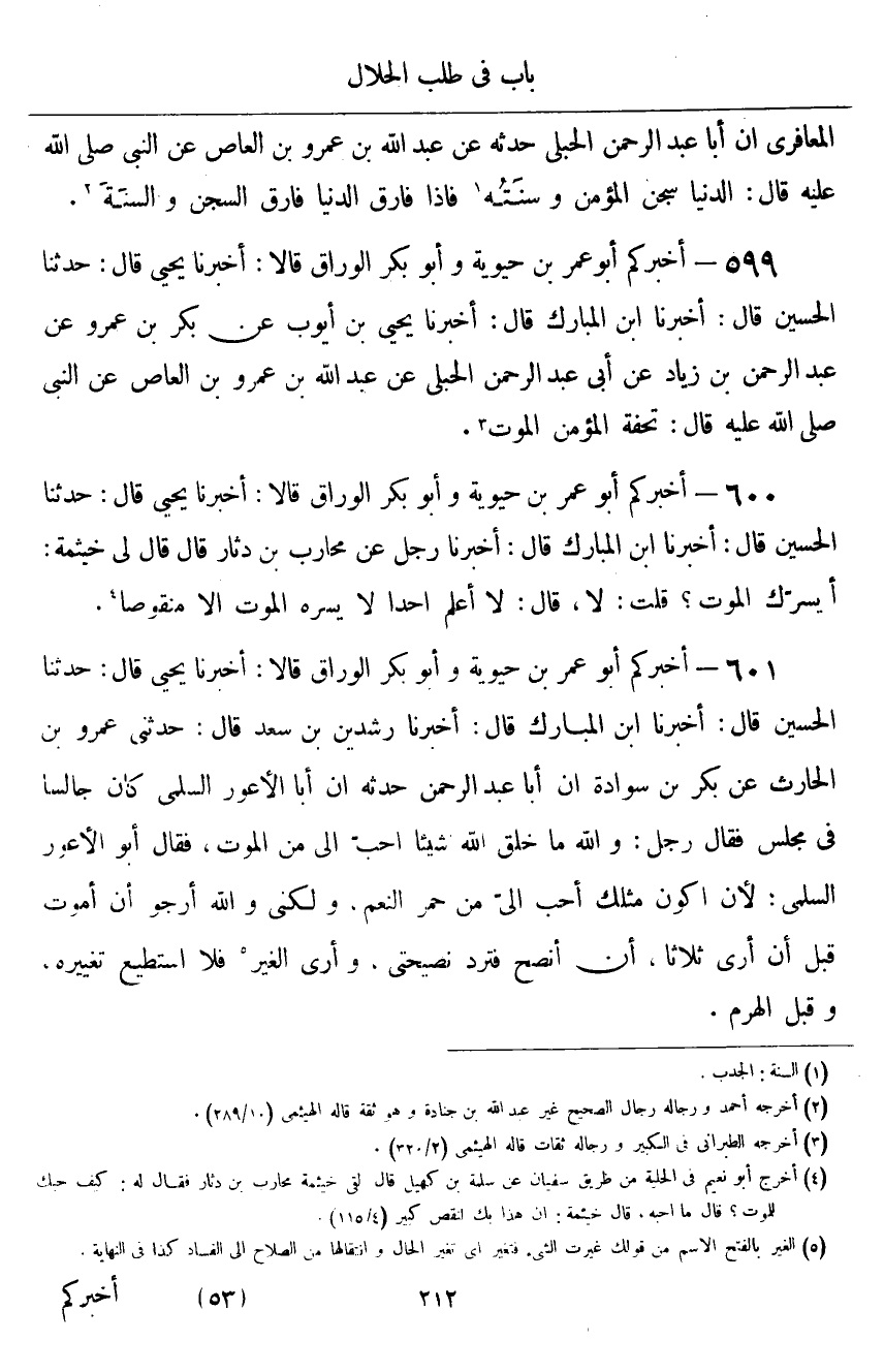 ٥٩٩ - أَخْبَرَكُمْ أَبُو عُمَرَ بْنُ حَيَوَيْهِ، وَأَبُو بَكْرٍ الْوَرَّاقُ قَالَا: أَخْبَرَنَا يَحْيَى قَالَ: حَدَّثَنَا الْحُسَيْنُ قَالَ: أَخْبَرَنَا ابْنُ الْمُبَارَكِ قَالَ: أَخْبَرَنَا يَحْيَى بْنُ أَيُّوبَ، عَنْ بَكْرِ بْنِ عَمْرٍو، عَنْ عَبْدِ الرَّحْمَنِ بْنِ زِيَادٍ، عَنْ أَبِي عَبْدِ الرَّحْمَنِ الْحُبُلِيِّ، عَنْ عَبْدِ اللَّهِ بْنِ عَمْرِو بْنِ الْعَاصِ، عَنِ النَّبِيِّ صَلَّى اللهُ عَلَيْهِ وَسَلَّمَ قَالَ: «تُحْفَةُ الْمُؤْمِنِ الْمَوْتُ»