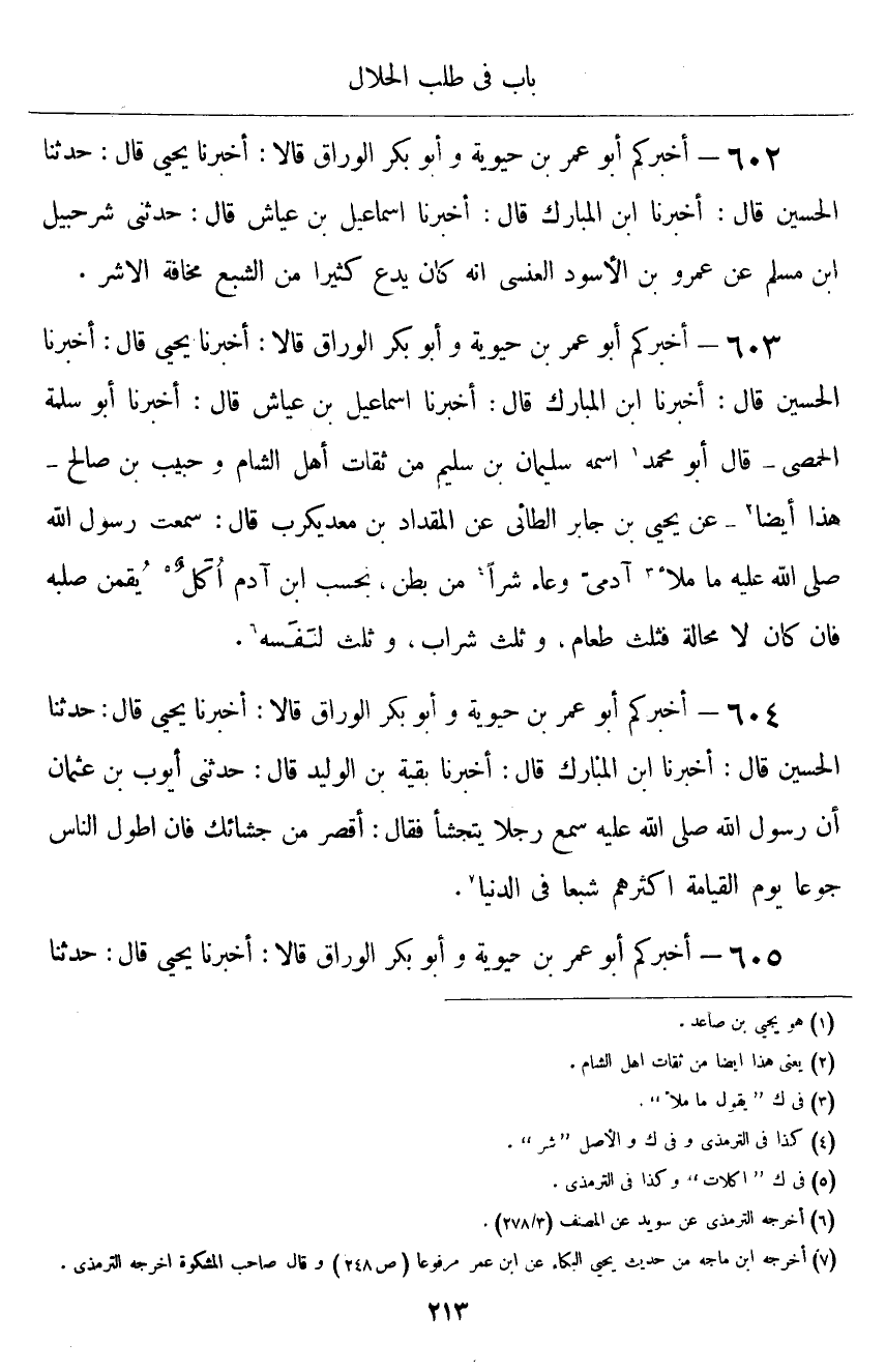 ٦٠٣ - أَخْبَرَكُمْ أَبُو عُمَرَ بْنُ حَيَوَيْهِ، وَأَبُو بَكْرٍ الْوَرَّاقُ قَالَا: أَخْبَرَنَا يَحْيَى قَالَ: حَدَّثَنَا الْحُسَيْنُ قَالَ: أَخْبَرَنَا ابْنُ الْمُبَارَكِ قَالَ: أَخْبَرَنَا إِسْمَاعِيلُ بْنُ عَيَّاشٍ قَالَ: أَخْبَرَنَا أَبُو سَلَمَةَ الْحِمْصِيُّ - قَالَ: أَبُو مُحَمَّدٍ اسْمُهُ سُلَيْمَانُ بْنُ سُلَيْمٍ، مِنْ ثِقَاتِ أَهْلِ الشَّامِ، وَحَبِيبُ بْنُ صَالِحٍ هَذَا أَيْضًا - عَنْ يَحْيَى بْنِ جَابِرٍ الطَّائِيِّ، عَنِ الْمِقْدَامِ بْنِ مَعْدِي كَرِبَ قَالَ: سَمِعْتُ رَسُولَ اللَّهِ صَلَّى اللهُ عَلَيْهِ وَسَلَّمَ «مَا مَلَأَ آدَمِيٌّ وِعَاءً شَرًّا مِنْ بَطْنٍ، بِحَسْبِ ابْنِ آدَمَ أُكُلٌ يُقِمْنَ صُلْبَهُ، فَإِنْ كَانَ لَا مَحَالَةَ فَثُلُثٌ طَعَامٌ، وَثُلُثٌ شَرَابٌ، وَثُلُثٌ لِنَفَسِهِ»