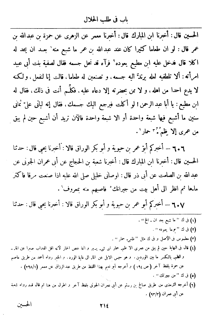 ٦٠٧ - أَخْبَرَكُمْ أَبُو عُمَرَ بْنُ حَيَوَيْهِ، وَأَبُو بَكْرٍ الْوَرَّاقُ قَالَا: أَخْبَرَنَا يَحْيَى قَالَ: حَدَّثَنَا ⦗٢١٥⦘ الْحُسَيْنُ قَالَ: أَخْبَرَنَا ابْنُ الْمُبَارَكِ قَالَ: أَخْبَرَنَا ابْنُ لَهِيعَةَ، عَنْ مُحَمَّدِ بْنِ عَبْدِ الرَّحْمَنِ بْنِ نَوْفَلٍ الْأَسَدِيِّ أَنَّ صَفِيَّةَ بِنْتَ أَبِي عُبَيْدٍ، قَالَتْ: " مَا رَأَيْتُهُ شَبِعَ، فَأَقُولُ قَدْ شَبِعَ - تَعْنِي ابْنَ عُمَرَ - فَلَمَّا رَأَيْتُهُ ذَلِكَ، وَكَانَ لَهُ يَتِيمَانِ، صَنَعْتُ لَهُ شَيْئًا، فَدَعَاهُمَا، فَأَكَلَا مَعَهُ، فَلَمَّا نَامَا جِئْتُهُ بِشَيْءٍ، فَقَالَ: ادْعُ فُلَانَةً، قُلْتُ: قَدْ نَامَا، وَقَدْ أَشْبَعْتُهُمَا، قَالَ: فَادْعِي لِي بَعْضَ أَهْلِ الصُّفَّةِ، فَدُعِيَ لَهُ مَسَاكِينُ، فَأَكَلُوا مَعَهُ "