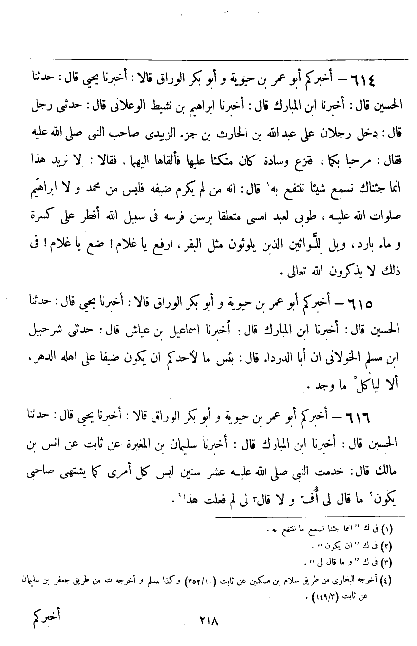 ٦١٤ - أَخْبَرَكُمْ أَبُو عُمَرَ بْنُ حَيَوَيْهِ، وَأَبُو بَكْرٍ الْوَرَّاقُ قَالَا: أَخْبَرَنَا يَحْيَى قَالَ: حَدَّثَنَا الْحُسَيْنُ قَالَ: أَخْبَرَنَا ابْنُ الْمُبَارَكِ قَالَ: أَخْبَرَنَا إِبْرَاهِيمُ بْنُ نَشِيطٍ الْوَعْلَانِيُّ قَالَ: حَدَّثَنِي رَجُلٌ قَالَ: دَخَلَ رَجُلَانِ عَلَى عَبْدِ اللَّهِ بْنِ الْحَارِثِ بْنِ جَزْءٍ الزُّبَيْدِيِّ - صَاحِبِ النَّبِيِّ صَلَّى اللهُ عَلَيْهِ وَسَلَّمَ - فَقَالَ: " مَرْحَبًا بِكُمَا، فَنَزَعَ وِسَادَةً كَانَ مُتَّكِئًا عَلَيْهَا، فَأَلْقَاهَا إِلَيْهِمَا، فَقَالَا: لَا نُرِيدُ هَذَا، إِنَّمَا جِئْنَا نَسْمَعُ شَيْئًا نَنْتَفِعُ بِهِ، قَالَ: إِنَّهُ مَنْ لَمْ يُكرِمْ ضَيْفَهُ فَلَيْسَ مِنْ مُحَمَّدٍ، وَلَا إِبْرَاهِيمَ صَلَوَاتُ اللَّهِ عَلَيْهِ، طُوبَى لِعَبْدٍ أَمْسَى مُتَعَلِّقًا بِرَسَنِ فَرَسِهِ فِي سَبِيلِ اللَّهِ، أَفْطَرَ عَلَى كِسْرَةٍ، وَمَاءٍ بَارِدٍ، وَيْلٌ لِلَّوَّاثِينَ الَّذِينَ يَلُوثُونَ مِثْلَ الْبَقَرِ، ارْفَعْ يَا غُلَامُ، ضَعْ يَا غُلَامُ، فِي ذَلِكَ لَا يَذْكُرُونَ اللَّهَ تَعَالَى "