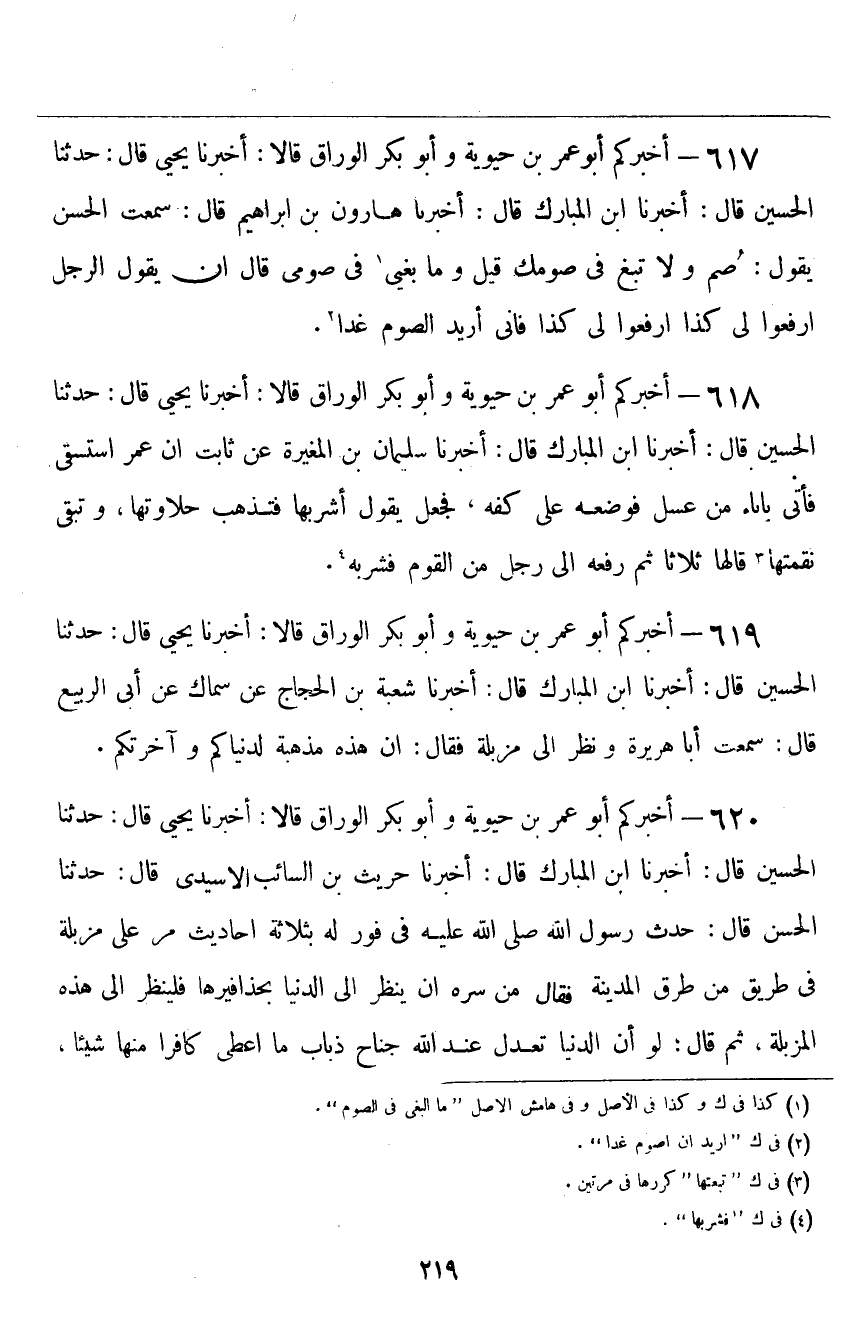 ٦١٧ - أَخْبَرَكُمْ أَبُو عُمَرَ بْنُ حَيَوَيْهِ، وَأَبُو بَكْرٍ الْوَرَّاقُ قَالَا: أَخْبَرَنَا يَحْيَى قَالَ: حَدَّثَنَا الْحُسَيْنُ قَالَ: أَخْبَرَنَا ابْنُ الْمُبَارَكِ قَالَ: أَخْبَرَنَا هَارُونُ بْنُ إِبْرَاهِيمَ قَالَ: سَمِعْتُ الْحَسَنَ يَقُولُ: «صُمْ وَلَا تَبْغِ فِي صَوْمِكَ» قِيلَ: وَمَا بَغْيِي فِي صَوْمِي؟ قَالَ: " أَنْ يَقُولَ الرَّجُلُ: ارْفَعُوا لِي كَذَا، ارْفَعُوا لِي كَذَا، فَإِنِّي أُرِيدُ الصَّوْمَ غَدًا "