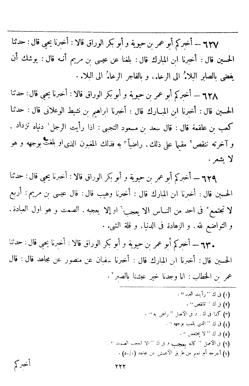 ٦٣٠ - أَخْبَرَكُمْ أَبُو عُمَرَ بْنُ حَيَوَيْهِ، وَأَبُو بَكْرٍ الْوَرَّاقُ قَالَا: أَخْبَرَنَا يَحْيَى قَالَ: حَدَّثَنَا الْحُسَيْنُ قَالَ: أَخْبَرَنَا ابْنُ الْمُبَارَكِ قَالَ: أَخْبَرَنَا سُفْيَانُ، عَنْ مَنْصُورٍ، عَنْ مُجَاهِدٍ قَالَ: قَالَ عُمَرُ بْنُ الْخَطَّابِ: «إِنَّا وَجَدْنَا خَيْرَ عَيْشِنَا بِالصَّبِرِ»