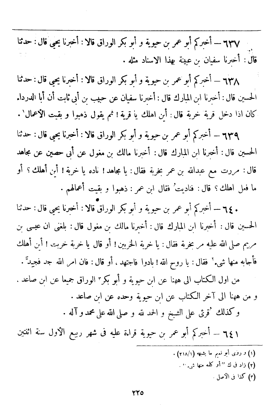 ٦٤١ - أَخْبَرَكُمْ أَبُو عُمَرَ بْنُ حَيَوَيْهِ، وَأَبُو بَكْرٍ الْوَرَّاقُ قَالَا: أَخْبَرَنَا يَحْيَى قَالَ: حَدَّثَنَا الْحُسَيْنُ قَالَ: أَخْبَرَنَا ابْنُ الْمُبَارَكِ قَالَ: أَخْبَرَنَا مَالِكُ بْنُ مِغْوَلٍ قَالَ: بَلَغَنِي أَنَّ عِيسَى ابْنَ مَرْيَمَ صَلَّى اللَّهُ عَلَيْهِ مَرَّ بِخَرِبَةٍ فَقَالَ: " يَا خَرِبَةُ الْخَرِبِينَ، أَوْ قَالَ: يَا خَرِبَةُ خَرِبَتْ، أَيْنَ أَهْلُكِ؟ فَأَجَابَهُ مِنْهَا شَيْءٌ، فَقَالَ: " يَا رُوحَ اللَّهِ، بَادَوْا، فَاجْتَهِدْ - أَوْ قَالَ: فَإِنَّ أَمْرَ اللَّهِ جَدٌّ، فَجِدَّ "
