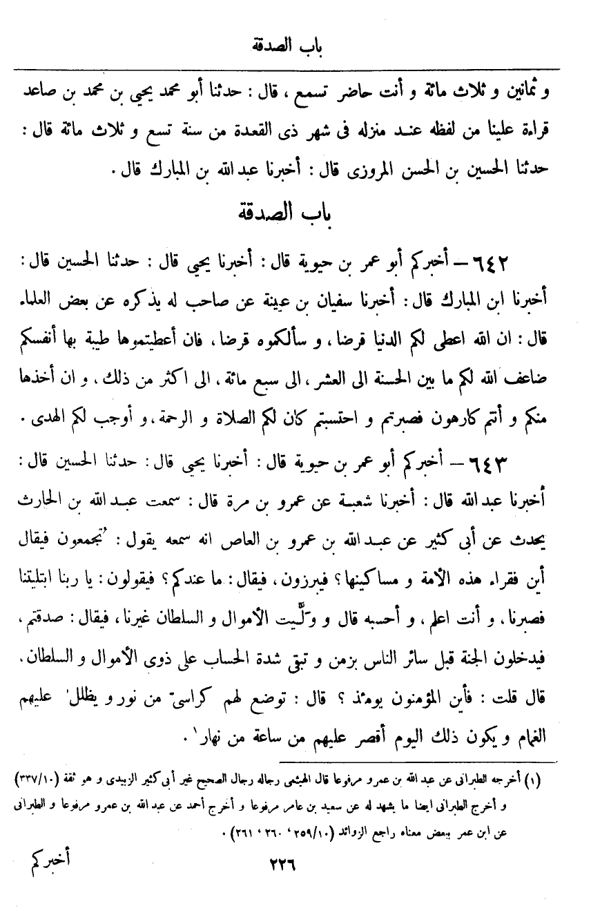 أَخْبَرَكُمْ أَبُو عُمَرَ بْنُ حَيَوَيْهِ قَالَ: أَخْبَرَنَا يَحْيَى قَالَ: حَدَّثَنَا الْحُسَيْنُ قَالَ: أَخْبَرَنَا ابْنُ الْمُبَارَكِ قَالَ: أَخْبَرَنَا سُفْيَانُ بْنُ عُيَيْنَةَ، عَنْ صَاحِبٍ لَهُ يَذْكُرُهُ، عَنْ بَعْضِ الْعُلَمَاءِ قَالَ: «إِنَّ اللَّهَ أَعْطَى لَكُمُ الدُّنْيَا قَرْضًا وَسَأَلَكُمُوهُ قَرْضًا، فَإِنْ أَعْطَيْتُمُوهَا طَيِّبَةً بِهَا أَنْفُسُكُمْ ضَاعَفَ اللَّهُ لَكُمْ مَا بَيْنَ الْحَسَنَةِ إِلَى الْعَشْرِ، إِلَى سَبْعِ مِائَةٍ، إِلَى أَكْثَرَ مِنْ ذَلِكَ، وَإِنْ أَخَذَهَا مِنْكُمْ وَأَنْتُمْ كَارِهُونَ، فَصَبَرْتُمْ، وَاحْتَسَبْتُمْ كَانَ لَكُمُ الصَّلَاةُ وَالرَّحْمَةُ، وَأَوْجَبَ لَكُمُ الْهُدَى»