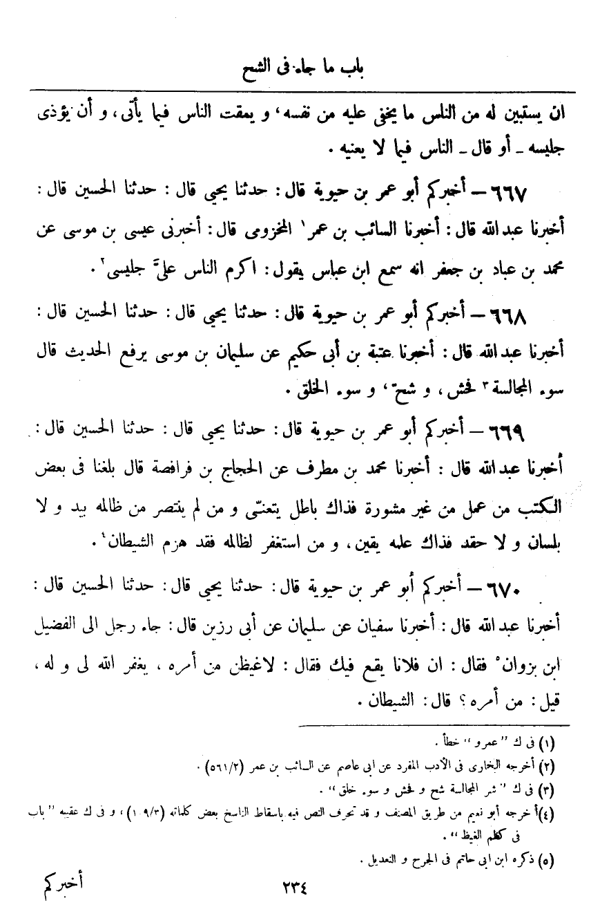 ٦٦٨ - أَخْبَرَكُمْ أَبُو عُمَرَ بْنُ حَيَوَيْهِ قَالَ: أَخْبَرَنَا يَحْيَى قَالَ: حَدَّثَنَا الْحُسَيْنُ قَالَ: أَخْبَرَنَا عَبْدُ اللَّهِ قَالَ: أَخْبَرَنَا عُتْبَةُ بْنُ أَبِي حَكِيمٍ، عَنْ سُلَيْمَانَ بْنِ مُوسَى، يَرْفَعُ الْحَدِيثَ، قَالَ: «سُوءُ الْمُجَالَسَةِ فُحْشٌ، وَشُحٌّ، وَسُوءُ الْخُلُقِ»