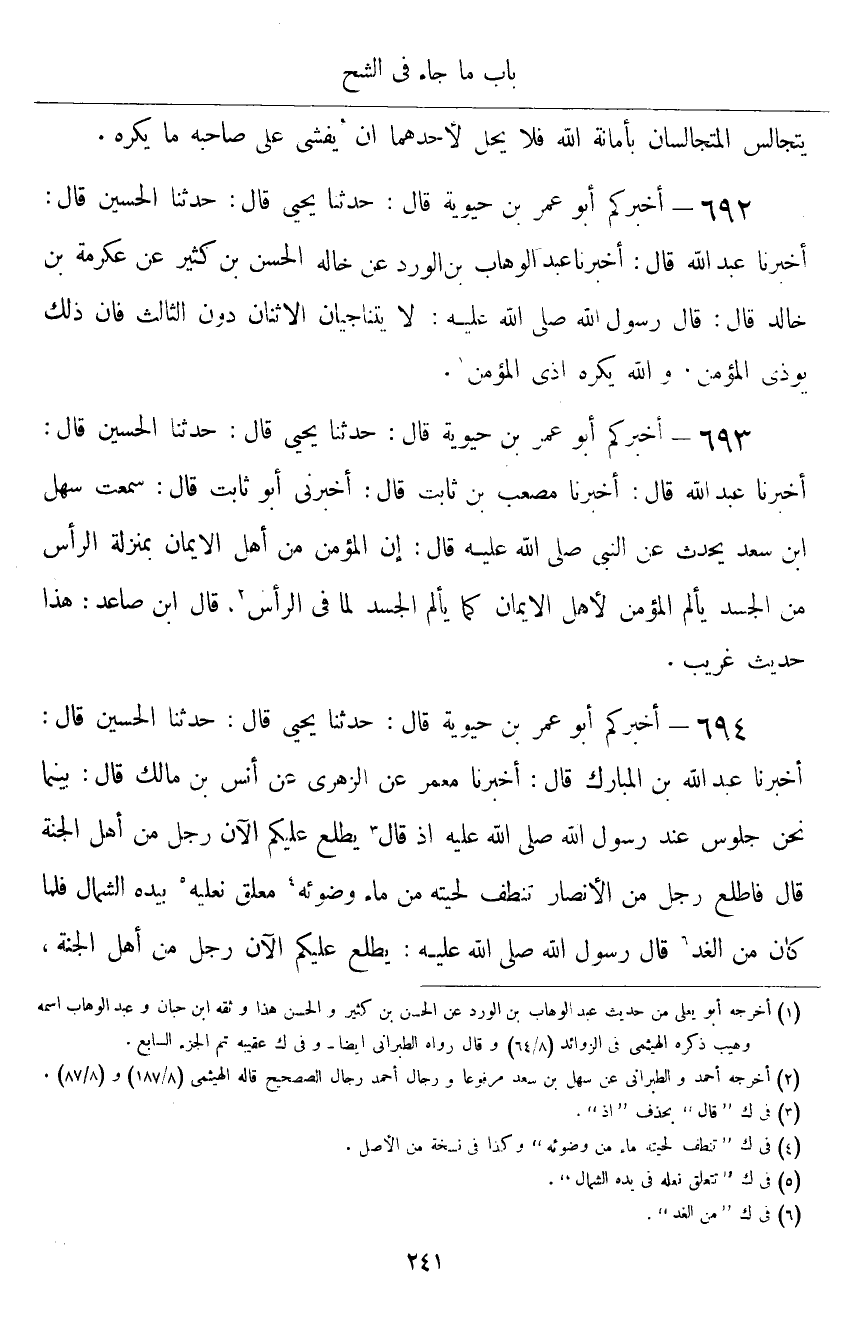 ٦٩٤ - أَخْبَرَكُمْ أَبُو عُمَرَ بْنُ حَيَوَيْهِ قَالَ: أَخْبَرَنَا يَحْيَى قَالَ: حَدَّثَنَا الْحُسَيْنُ قَالَ: أَخْبَرَنَا عَبْدُ اللَّهِ قَالَ: أَخْبَرَنَا مَعْمَرٌ، عَنِ الزُّهْرِيِّ، عَنْ أَنَسِ بْنِ مَالِكٍ قَالَ: بَيْنَمَا نَحْنُ جُلُوسٌ عِنْدَ رَسُولِ اللَّهِ صَلَّى اللَّهُ عَلَيْهِ إِذْ قَالَ: «يَطْلُعُ عَلَيْكُمُ الْآنَ رَجُلٌ مِنْ أَهْلِ الْجَنَّةِ» ، قَالَ: فَاطَّلَعَ رَجُلٌ مِنَ الْأَنْصَارِ، تَنْطِفُ لِحْيَتُهُ مِنْ مَاءِ وُضُوئِهِ، مُعَلِّقٌ نَعْلَيْهِ بِيَدِهِ الشِّمَالِ، فَلَمَّا كَانَ مِنَ الْغَدِ، قَالَ رَسُولُ اللَّهِ صَلَّى اللهُ عَلَيْهِ وَسَلَّمَ: «يَطْلُعُ عَلَيْكُمُ الْآنَ رَجُلٌ مِنْ أَهْلِ الْجَنَّةِ» ⦗٢٤٢⦘، فَاطَّلَعَ ذَلِكَ الرَّجُلُ عَلَى مِثْلِ مَرْتَبَتِهِ الْأُولَى، فَلَمَّا كَانَ مِنَ الْغَدِ، قَالَ رَسُولُ اللَّهِ صَلَّى اللهُ عَلَيْهِ وَسَلَّمَ: «يَطْلُعُ عَلَيْكُمُ الْآنَ رَجُلٌ مِنْ أَهْلِ الْجَنَّةِ» ، فَاطَّلَعَ ذَلِكَ الرَّجُلُ عَلَى مِثْلِ مَرْتَبَتِهِ الْأُولَى، فَلَمَّا قَامَ رَسُولُ اللَّهِ صَلَّى اللهُ عَلَيْهِ وَسَلَّمَ اتَّبَعَهُ عَبْدُ اللَّهِ بْنُ عَمْرِو بْنِ الْعَاصِ، فَقَالَ لَهُ: إِنِّي لَاحَيْتُ أَبِي، فَأَقْسَمْتُ إِنِّي لَا أَدْخُلُ عَلَيْهِ ثَلَاثَ لَيَالٍ، فَإِنْ رَأَيْتَ أَنْ تُؤْوِيَنِي إِلَيْكَ حَتَّى تَحِلَّ يَمِينِي فَعَلْتَ، قَالَ: نَعَمْ، قَالَ أَنَسٌ: فَكَانَ عَبْدُ اللَّهِ بْنُ عَمْرِو بْنِ الْعَاصِ يُحَدِّثُ أَنَّهُ بَاتَ مَعَهُ ثَلَاثَ لَيَالٍ، فَلَمْ يَرَهُ يَقُومُ مِنَ اللَّيْلِ بِشَيْءٍ، غَيْرَ أَنَّهُ إِذَا تَقَلَّبَ عَلَى فِرَاشِهِ ذَكَرَ اللَّهَ، وَكَبَّرَهُ حَتَّى يَقُومَ لِصَلَاةِ الْفَجْرِ، فَيُسْبِغَ الْوُضُوءَ، قَالَ عَبْدُ اللَّهِ: غَيْرَ أَنَّى لَا أَسْمَعُهُ يَقُولُ إِلَّا خَيْرًا، فَلَمَّا مَضَتِ الثَّلَاثُ اللَّيَالِي، وَكِدْتُ أَنْ أَحْتَقِرَ عَمَلَهُ، قُلْتُ: يَا عَبْدَ اللَّهِ، إِنَّهُ لَمْ يَكُنْ بَيْنِي وَبَيْنَ وَالِدِي غَضَبٌ، وَلَا هَجْرٌ، وَلَكِنِّي سَمِعْتُ رَسُولَ اللَّهِ صَلَّى اللهُ عَلَيْهِ وَسَلَّمَ يَقُولُ لَكَ ثَلَاثَ مَرَّاتٍ فِي ثَلَاثَةِ مَجَالِسَ: «يَطْلُعُ عَلَيْكُمُ الْآنَ رَجُلٌ مِنْ أَهْلِ الْجَنَّةِ» ، فَاطَّلَعْتَ أَنْتَ فِي تِلْكَ الثَّلَاثِ مَرَّاتٍ، فَأَرَدْتُ أَنْ آوِيَ إِلَيْكَ؛ فَأَنْظُرَ مَا عَمَلُكَ؟ فَأَقْتَدِيَ بِكَ، فَلَمْ أَرَكَ تَعْمَلُ كَبِيرَ عَمَلٍ، فَمَا الَّذِي بَلَغَ بِكَ مَا قَالَ رَسُولُ اللَّهِ صَلَّى اللهُ عَلَيْهِ وَسَلَّمَ؟ قَالَ: مَا هُوَ إِلَّا مَا رَأَيْتَ، فَانْصَرَفْتُ عَنْهُ، فَلَمَّا وَلَّيْتُ، دَعَانِي، وَقَالَ: مَا هُوَ إِلَّا مَا رَأَيْتَ، غَيْرَ أَنِّي لَا أَجِدُ فِي نَفْسِي غِلًّا لِأَحَدٍ مِنَ الْمُسْلِمِينَ، وَلَا أَحْسِدُهُ عَلَى خَيْرٍ أَعْطَاهُ اللَّهُ إِيَّاهُ، فَقَالَ لَهُ عَبْدُ اللَّهِ بْنُ عَمْرٍو: هَذِهِ الَّتِي بَلَغَتْ بِكَ، وَهِيَ الَّتِي لَا نُطِيقُ