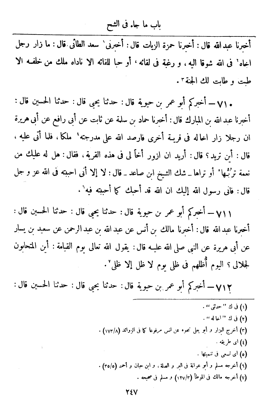 ٧١٠ - أَخْبَرَكُمْ أَبُو عُمَرَ بْنُ حَيَوَيْهِ قَالَ: أَخْبَرَنَا يَحْيَى قَالَ: حَدَّثَنَا الْحُسَيْنُ قَالَ: أَخْبَرَنَا عَبْدُ اللَّهِ بْنُ الْمُبَارَكِ قَالَ: أَخْبَرَنَا حَمَّادُ بْنُ سَلَمَةَ، عَنْ ثَابِتٍ، عَنْ أَبِي رَافِعٍ، عَنْ أَبِي هُرَيْرَةَ " أَنَّ رَجُلًا زَارَ أَخًا لَهُ فِي قَرْيَةٍ أُخْرَى، فَأَرْصَدَ اللَّهُ عَلَى مُدْرَجَتِهِ مَلَكًا، فَلَمَّا أَتَى عَلَيْهِ، قَالَ: أَيْنَ تُرِيدُ؟ قَالَ: أُرِيدُ أَنْ أَزُورَ أَخًا لِي فِي هَذِهِ الْقَرْيَةِ، فَقَالَ: هَلْ لَهُ عَلَيْكَ مِنْ نِعْمَةٍ تَرُبُّهَا أَوْ تَرَاهَا؟ - شَكَّ الشَّيْخُ ابْنُ صَاعِدٍ - قَالَ: لَا، إِلَّا أَنِّي أَحْبَبْتُهُ فِي اللَّهِ عَزَّ وَجَلَّ، قَالَ: فَإِنِّي رَسُولُ اللَّهِ إِلَيْكَ، إِنَّ اللَّهَ قَدْ أَحَبَّكَ كَمَا أَحْبَبْتَهُ فِيهِ "
