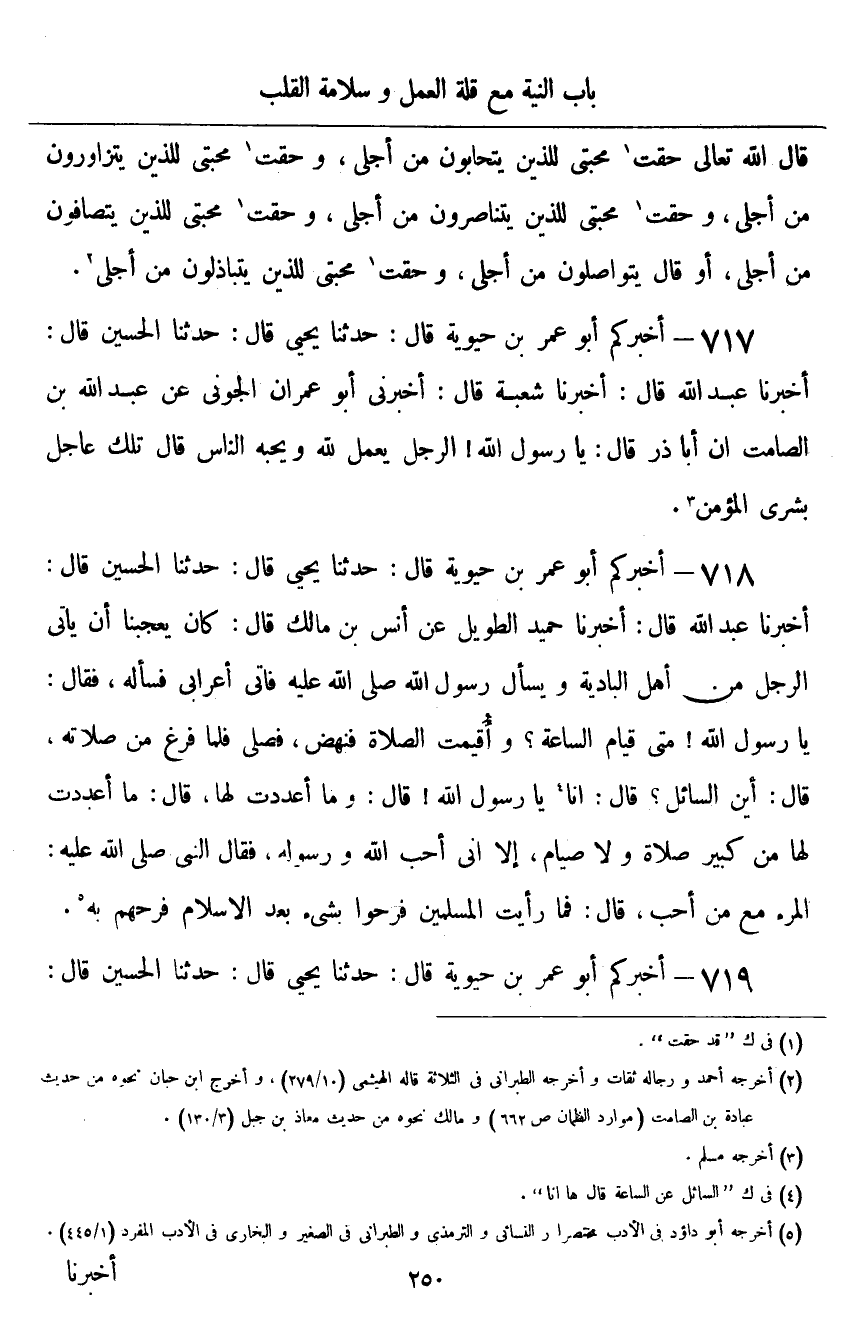 ٧١٨ - أَخْبَرَكُمْ أَبُو عُمَرَ بْنُ حَيَوَيْهِ قَالَ: أَخْبَرَنَا يَحْيَى قَالَ: حَدَّثَنَا الْحُسَيْنُ قَالَ: أَخْبَرَنَا عَبْدُ اللَّهِ قَالَ: أَخْبَرَنَا حُمَيْدٌ الطَّوِيلُ، عَنْ أَنَسِ بْنِ مَالِكٍ قَالَ: كَانَ يُعْجِبُنَا أَنْ يَأْتِيَ الرَّجُلُ مِنْ أَهْلِ الْبَادِيَةِ وَيَسْأَلَ رَسُولَ اللَّهِ صَلَّى اللهُ عَلَيْهِ وَسَلَّمَ، فَأَتَى أَعْرَابِيٌّ، فَسَأَلَهُ، فَقَالَ: يَا رَسُولَ اللَّهِ، مَتَى قِيَامُ السَّاعَةِ؟ وَأُقِيمَتِ الصَّلَاةُ، فَنَهَضَ فَصَلَّى، فَلَمَّا فَرَغَ مِنْ صَلَاتِهِ، قَالَ: «أَيْنَ السَّائِلُ؟» قَالَ: أَنَا يَا رَسُولَ اللَّهِ، قَالَ: «وَمَا أَعْدَدْتَ لَهَا؟» قَالَ: مَا أَعْدَدْتُ لَهَا مِنْ كَبِيرِ صَلَاةٍ، وَلَا صِيَامٍ، إِلَّا أَنِّي أُحِبُّ اللَّهَ وَرَسُولَهُ، فَقَالَ النَّبِيُّ صَلَّى اللهُ عَلَيْهِ وَسَلَّمَ: «الْمَرْءُ مَعَ مَنْ أَحَبَّ» ، قَالَ: فَمَا رَأَيْتُ الْمُسْلِمِينَ فَرِحُوا بِشَيْءٍ بَعْدَ الْإِسْلَامِ فَرَحَهُمْ بِهِ