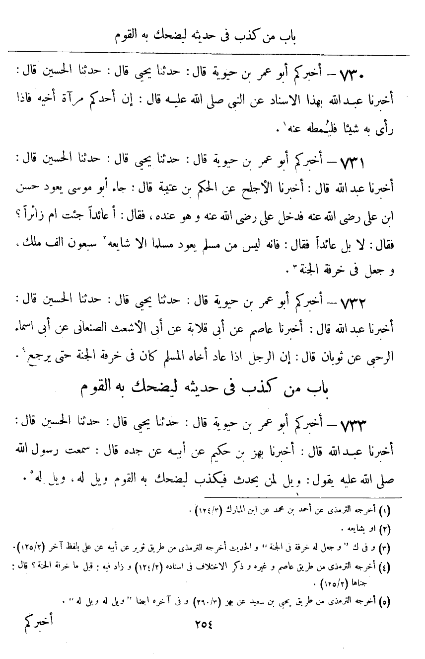 ٧٣٣ - أَخْبَرَكُمْ أَبُو عُمَرَ بْنُ حَيَوَيْهِ قَالَ: أَخْبَرَنَا يَحْيَى قَالَ: حَدَّثَنَا الْحُسَيْنُ قَالَ: أَخْبَرَنَا عَبْدُ اللَّهِ قَالَ: أَخْبَرَنَا بَهْزُ بْنُ حَكِيمٍ، عَنْ أَبِيهِ، عَنْ جَدَّهِ قَالَ: سَمِعْتُ رَسُولَ اللَّهِ صَلَّى اللهُ عَلَيْهِ وَسَلَّمَ يَقُولُ: «وَيْلٌ لِمَنْ يُحَدِّثُ فَيَكْذِبُ؛ لِيُضْحِكَ بِهِ الْقَوْمَ، وَيْلٌ لَهُ، وَيْلٌ لَهُ»