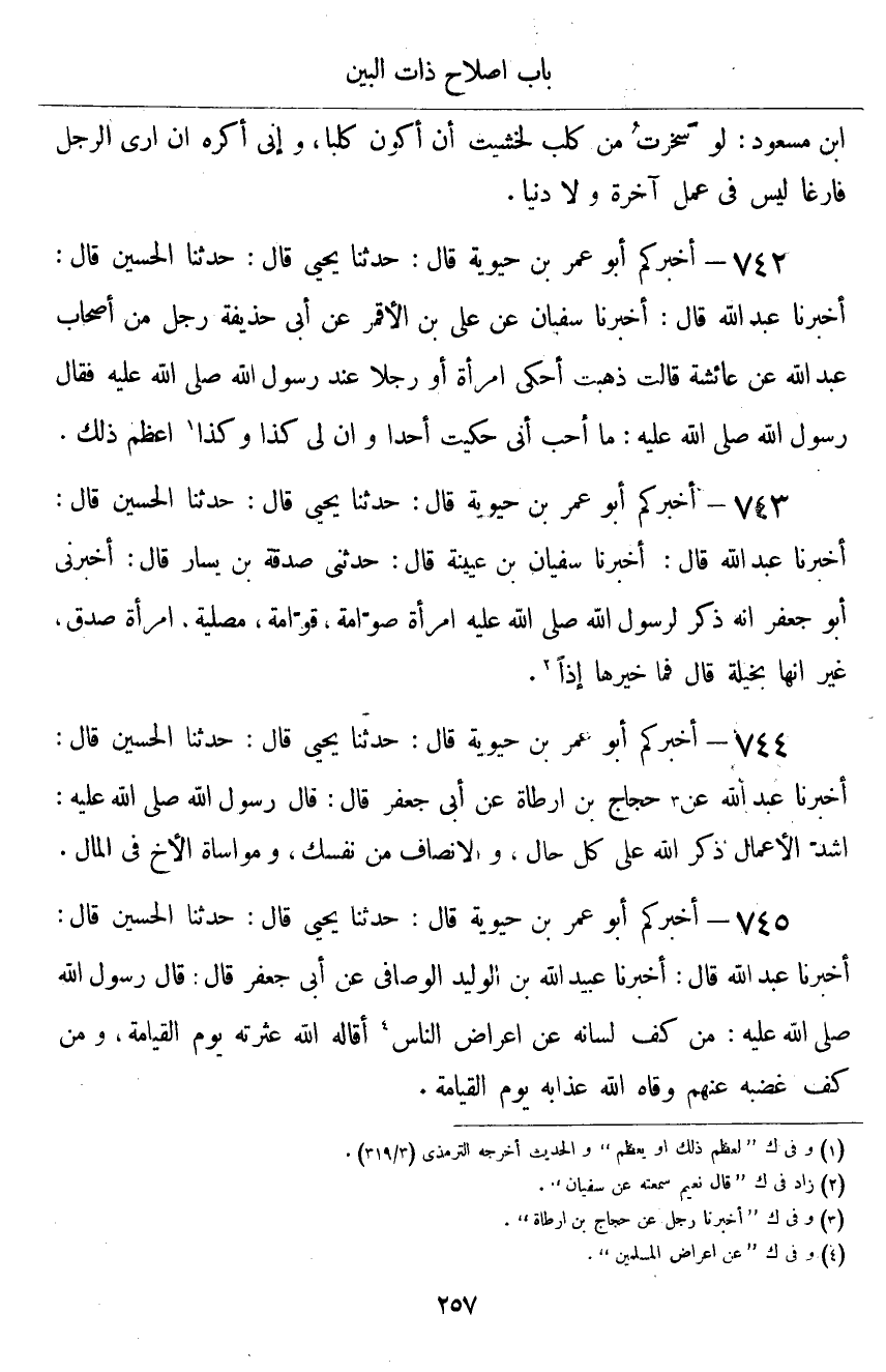 ٧٤٢ - أَخْبَرَكُمْ أَبُو عُمَرَ بْنُ حَيَوَيْهِ قَالَ: أَخْبَرَنَا يَحْيَى قَالَ: حَدَّثَنَا الْحُسَيْنُ قَالَ: أَخْبَرَنَا عَبْدُ اللَّهِ قَالَ: أَخْبَرَنَا سُفْيَانُ، عَنْ عَلِيِّ بْنِ الْأَقْمَرِ، عَنْ أَبِي حُذَيْفَةَ - رَجُلٌ مِنْ أَصْحَابِ عَبْدِ اللَّهِ - عَنْ عَائِشَةَ قَالَتْ: ذَهَبْتُ أَحْكِي امْرَأَةً، أَوْ رَجُلًا عِنْدَ رَسُولِ اللَّهِ صَلَّى اللهُ عَلَيْهِ وَسَلَّمَ، فَقَالَ رَسُولُ اللَّهِ صَلَّى اللهُ عَلَيْهِ وَسَلَّمَ: «مَا أُحِبُّ أَنِّي حَكَيْتُ أَحَدًا، وَأَنَّ لِي كَذَا وَكَذَا , أَعْظَمَ ذَلِكَ»