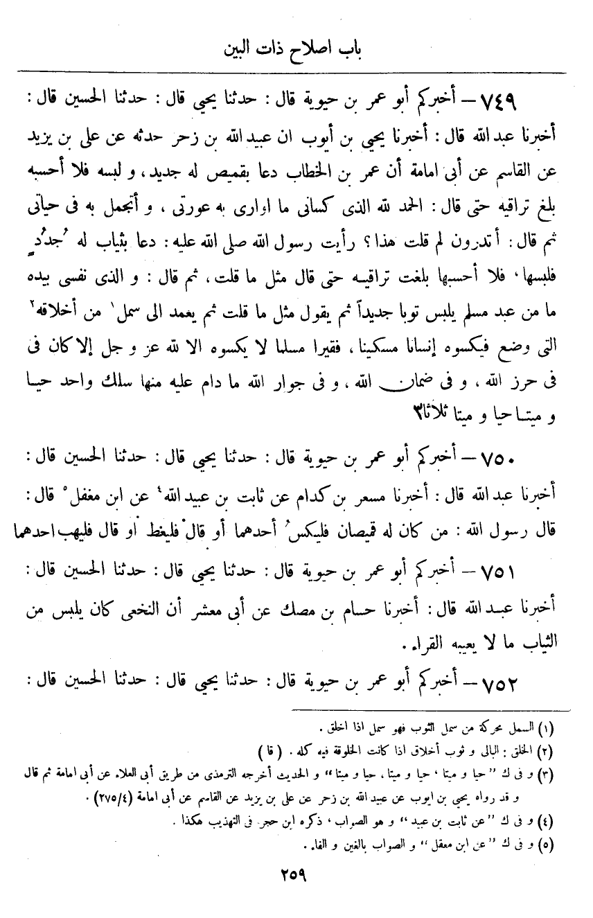 ٧٤٩ - أَخْبَرَكُمْ أَبُو عُمَرَ بْنُ حَيَوَيْهِ قَالَ: أَخْبَرَنَا يَحْيَى قَالَ: حَدَّثَنَا الْحُسَيْنُ قَالَ: أَخْبَرَنَا عَبْدُ اللَّهِ قَالَ: أَخْبَرَنَا يَحْيَى بْنُ أَيُّوبَ أَنَّ عُبَيْدَ اللَّهِ بْنَ زَحْرٍ حَدَّثَهُ عَنْ عَلِيِّ بْنِ يَزِيدَ، عَنِ الْقَاسِمِ، عَنْ أَبِي أُمَامَةَ أَنَّ عُمَرَ بْنَ الْخَطَّابِ دَعَا بِقَمِيصٍ لَهُ جَدِيدٍ، وَلَبِسَهُ، فَلَا أَحْسَبُهُ بَلَغَ تَرَاقِيَهُ حَتَّى قَالَ: الْحَمْدُ لِلَّهِ الَّذِي كَسَانِي مَا أُوَارِي بِهِ عَوْرَتِي، وَأَتَجَمَّلُ بِهِ فِي حَيَاتِي، ثُمَّ قَالَ: أَتَدْرُونَ لِمَ قُلْتُ هَذَا؟ رَأَيْتُ رَسُولَ اللَّهِ صَلَّى اللهُ عَلَيْهِ وَسَلَّمَ دَعَا بِثِيَابٍ لَهُ جُدُدٍ فَلَبِسَهَا، فَلَا أَحْسِبُهَا بَلَغَتْ تَرَاقِيَهُ حَتَّى قَالَ مِثْلَ مَا قُلْتُ، ثُمَّ قَالَ: «وَالَّذِي نَفْسِي بِيَدِهِ، مَا مِنْ عَبْدٍ مُسْلِمٍ يَلْبَسُ ثَوْبًا جَدِيدًا، ثُمَّ يَقُولُ مِثْلَ مَا قُلْتُ، ثُمَّ يَعْمِدُ إِلَى سَمَلٍ مِنْ أَخْلَاقِهِ الَّتِي وَضَعَ، فَيَكْسُوهُ إِنْسَانًا مِسْكِينًا، فَقِيرًا مُسْلِمًا، لَا يَكْسُوهُ إِلَّا لِلَّهِ عَزَّ وَجَلَّ، إِلَّا كَانَ فِي حِرْزِ اللَّهِ، وَفِي ضَمَانِ اللَّهِ، وَفِي جِوَارِ اللَّهِ مَا دَامَ عَلَيْهِ مِنْهَا سِلْكٌ وَاحِدٌ، حَيًّا وَمَيِّتًا، حَيًّا وَمَيِّتًا» ثَلَاثًا