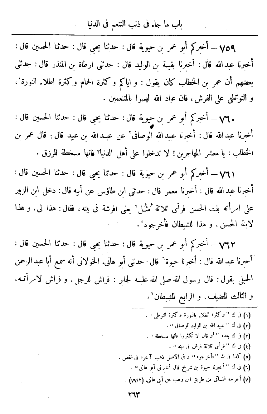 ٧٥٩ - أَخْبَرَكُمْ أَبُو عُمَرَ بْنُ حَيَوَيْهِ قَالَ: أَخْبَرَنَا يَحْيَى قَالَ: حَدَّثَنَا الْحُسَيْنُ قَالَ: أَخْبَرَنَا عَبْدُ اللَّهِ قَالَ: أَخْبَرَنَا بَقِيَّةُ بْنُ الْوَلِيدِ قَالَ: حَدَّثَنِي أَرْطَاةُ بْنُ الْمُنْذِرِ قَالَ: حَدَّثَنِي بَعْضُهُمْ أَنَّ عُمَرَ بْنَ الْخَطَّابِ كَانَ يَقُولُ: «وَإِيَّاكُمْ وَكَثْرَةَ الْحَمَّامِ، وَكَثْرَةَ الطِّلَاءِ بِالنُّورَةِ، وَالتَّوَطِّي عَلَى الْفُرُشِ، فَإِنَّ عِبَادَ اللَّهِ لَيْسُوا بِالْمُتَنَعِّمِينَ»