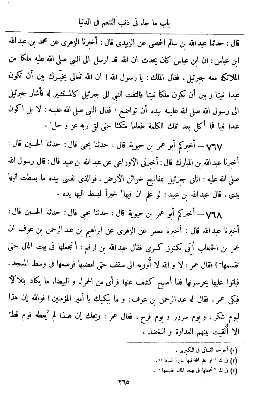 ٧٦٧ - أَخْبَرَكُمْ أَبُو عُمَرَ بْنُ حَيَوَيْهِ قَالَ: أَخْبَرَنَا يَحْيَى قَالَ: حَدَّثَنَا الْحُسَيْنُ قَالَ: أَخْبَرَنَا عَبْدُ اللَّهِ بْنُ الْمُبَارَكِ قَالَ: أَخْبَرَنِي الْأَوْزَاعِيُّ، عَنْ عَبْدِ اللَّهِ بْنِ عُبَيْدٍ قَالَ: قَالَ رَسُولُ اللَّهِ صَلَّى اللهُ عَلَيْهِ وَسَلَّمَ: «أَتَانِي جَبْرَئِيلُ بِمَفَاتِيحِ خَزَائِنِ الْأَرْضِ، فَوَالَّذِي نَفْسِي بِيَدِهِ مَا بَسَطْتُ إِلَيْهَا يَدِي» ، قَالَ عَبْدُ اللَّهِ بْنُ عُبَيْدٍ: لَوْ عَلِمَ أَنَّ فِيهَا خَيْرًا لَبَسَطَ إِلَيْهَا يَدَهُ "