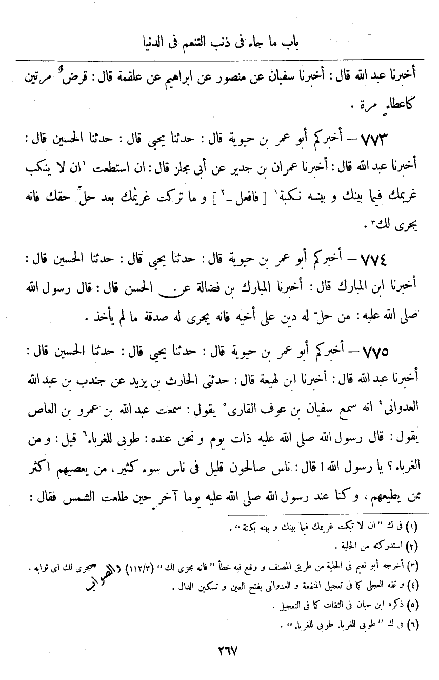 ٧٧٥ - أَخْبَرَكُمْ أَبُو عُمَرَ بْنُ حَيَوَيْهِ قَالَ: أَخْبَرَنَا يَحْيَى قَالَ: حَدَّثَنَا الْحُسَيْنُ قَالَ: أَخْبَرَنَا عَبْدُ اللَّهِ قَالَ: أَخْبَرَنَا ابْنُ لَهِيعَةَ قَالَ: حَدَّثَنِي الْحَارِثُ بْنُ يَزِيدَ، عَنْ جُنْدَبِ بْنِ عَبْدِ اللَّهِ الْعَدْوَانِيِّ أَنَّهُ سَمِعَ سُفْيَانَ بْنَ عَوْفٍ الْقَارِئَ يَقُولُ: سَمِعْتُ عَبْدَ اللَّهِ بْنَ عَمْرِو بْنِ الْعَاصِ يَقُولُ: قَالَ رَسُولُ اللَّهِ صَلَّى اللهُ عَلَيْهِ وَسَلَّمَ ذَاتَ يَوْمٍ وَنَحْنُ عِنْدَهُ: «طُوبَى لِلْغُرَبَاءِ» قِيلَ: وَمَنِ الْغُرَبَاءُ يَا رَسُولَ اللَّهِ؟ قَالَ: «نَاسٌ صَالِحُونَ قَلِيلٌ فِي نَاسِ سُوءٍ كَثِيرٍ، مَنْ يَعْصِيهِمْ أَكْثَرُ مِمَّنْ يُطِيعُهُمْ» ، وَكُنَّا عِنْدَ رَسُولِ اللَّهِ صَلَّى اللهُ عَلَيْهِ وَسَلَّمَ يَوْمًا آخَرَ حِينَ طَلَعَتِ الشَّمْسُ، فَقَالَ ⦗٢٦٨⦘: «سَيَأَتِي نَاسٌ مِنْ أُمَّتِي يَوْمَ الْقِيَامَةِ، نُورُهُمْ كَضَوْءِ الشَّمْسِ» ، قُلْنَا: وَمَنْ أُولَئِكَ يَا رَسُولَ اللَّهِ؟ قَالَ: «فُقَرَاءُ الْمُهَاجِرِينَ الَّذِينَ يُتَّقَى بِهِمُ الْمَكَارِهُ، يَمُوتُ أَحَدُهُمْ، وَحَاجُتُهُ فِي صَدْرِهِ، يُحْشَرُونَ مِنْ أَقْطَارِ الْأَرْضِ»