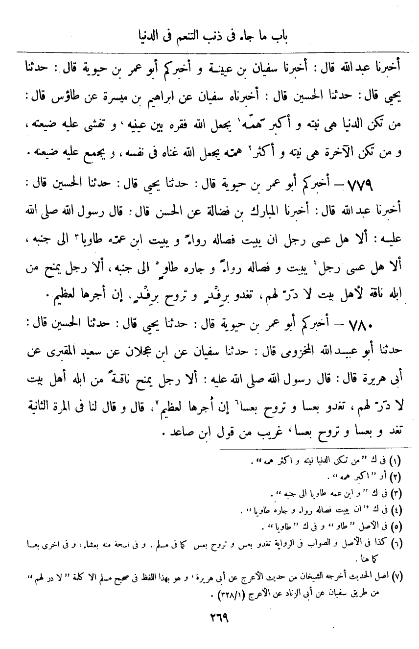 ٧٧٩ - أَخْبَرَكُمْ أَبُو عُمَرَ بْنُ حَيَوَيْهِ قَالَ: أَخْبَرَنَا يَحْيَى قَالَ: حَدَّثَنَا الْحُسَيْنُ قَالَ: أَخْبَرَنَا عَبْدُ اللَّهِ قَالَ: أَخْبَرَنَا الْمُبَارَكُ بْنُ فَضَالَةَ، عَنِ الْحَسَنِ قَالَ: قَالَ رَسُولُ اللَّهِ صَلَّى اللهُ عَلَيْهِ وَسَلَّمَ: «أَلَا هَلْ عَسَى رَجُلٌ أَنْ يَبِيتَ فِصَالُهُ رُوَاءً، وَيَبِيتَ ابْنُ عَمِّهِ طَاوِيًا إِلَى جَنْبِهِ، أَلَا هَلْ عَسَى رَجُلٌ يَبِيتُ وَفِصَالُهُ رُوَاءٌ، وَجَارُهُ طَاوٍ إِلَى جَنْبِهِ، أَلَا رَجُلٌ يَمْنَحُ مِنْ إِبِلِهِ نَاقَةً لِأَهْلِ بَيْتٍ لَا دَرَّ لَهُمْ، تَغْدُو بِرِفْدٍ، وَتَرُوحُ بِرِفْدٍ، إِنَّ أَجْرَهَا لَعَظِيمٌ»