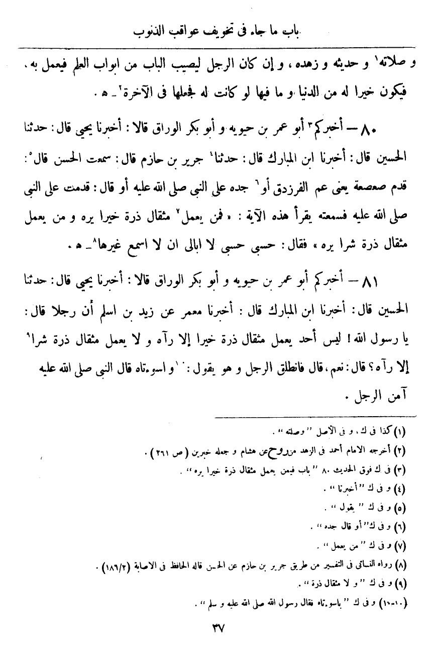 ٨٠ - أَخْبَرَكُمْ أَبُو عُمَرَ بْنُ حَيَوَيْهِ، وَأَبُو بَكْرٍ الْوَرَّاقُ قَالَا: أَخْبَرَنَا يَحْيَى قَالَ: حَدَّثَنَا الْحُسَيْنُ قَالَ: أَخْبَرَنَا ابْنُ الْمُبَارَكِ قَالَ: حَدَّثَنَا جَرِيرُ بْنُ حَازِمٍ قَالَ: سَمِعْتُ الْحَسَنَ قَالَ: قَدِمَ صَعْصَعَةُ، يَعْنِي عَمَّ الْفَرَزْدَقِ أَوْ جَدَّهُ، عَلَى النَّبِيِّ صَلَّى اللهُ عَلَيْهِ وَسَلَّمَ، أَوْ قَالَ: " قَدِمْتُ عَلَى النَّبِيِّ صَلَّى اللهُ عَلَيْهِ وَسَلَّمَ، فَسَمِعْتُهُ يَقْرَأُ هَذِهِ الْآيَةَ: {فَمَنْ يَعْمَلْ مِثْقَالَ ذَرَّةٍ خَيْرًا يَرَهُ وَمَنْ يَعْمَلْ مِثْقَالَ ذَرَّةٍ شَرًّا يَرَهُ} [الزلزلة: ٨] ، فَقَالَ: حَسْبِي حَسْبِي، لَا أُبَالِي أَنْ أَسْمَعَ غَيْرَهَا