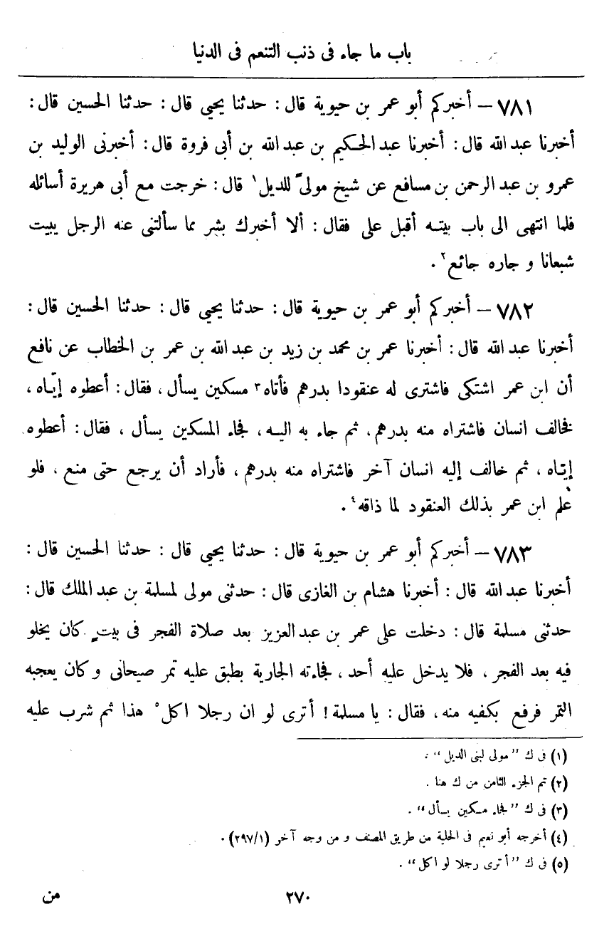 ٧٨٣ - أَخْبَرَكُمْ أَبُو عُمَرَ بْنُ حَيَوَيْهِ قَالَ: أَخْبَرَنَا يَحْيَى قَالَ: حَدَّثَنَا الْحُسَيْنُ قَالَ: أَخْبَرَنَا عَبْدُ اللَّهِ قَالَ: أَخْبَرَنَا هِشَامُ بْنُ الْغَازِي قَالَ: حَدَّثَنِي مَوْلًى لِمَسْلَمَةَ بْنِ عَبْدِ الْمَلِكِ قَالَ: حَدَّثَنِي مَسْلَمَةُ قَالَ: دَخَلْتُ عَلَى عُمَرَ بْنِ عَبْدِ الْعَزِيزِ بَعْدَ صَلَاةِ الْفَجْرِ فِي بَيْتٍ كَانَ يَخْلُو فِيهِ بَعْدَ الْفَجْرِ، فَلَا يَدْخُلُ عَلَيْهِ أَحَدٌ، فَجَاءَتْهُ الْجَارِيَةُ بِطَبَقٍ عَلَيْهِ تَمْرٌ صَيْحَانِيٌّ، وَكَانَ يُعْجِبُهُ التَّمْرُ، فَرَفَعَ بِكَفَّيْهِ مِنْهُ، فَقَالَ: " يَا مَسْلَمَةُ، أَتَرَى لَوْ أَنَّ رَجُلًا أَكَلَ هَذَا ثُمَّ شَرِبَ عَلَيْهِ ⦗٢٧١⦘ مِنَ الْمَاءِ - فَإِنَّ الْمَاءَ عَلَى التَّمْرِ طَيِّبٌ - أَكَانَ مُجْزِيهِ إِلَى اللَّيْلِ؟ قَالَ: قُلْتُ: لَا أَدْرِي، فَرَفَعَ أَكْثَرَ مِنْهُ، فَقَالَ: «فَهَذَا؟» قُلْتُ: نَعَمْ يَا أَمِيرَ الْمُؤْمِنِينَ، كَانَ كَافِيَهُ دُونَ مَا هَذَا حَتَّى مَا يُبَالِي أَنْ لَا يَذُوقَ طَعَامًا غَيْرَهُ، قَالَ: «فَعَلَامَ تُدْخَلُ النَّارُ؟» ، قَالَ: فَقَالَ مَسْلَمَةُ: «فَمَا وَقَعَتْ مِنِّي مَوْعِظَةٌ مَا وَقَعَتْ مِنِّي هَذِهِ»
