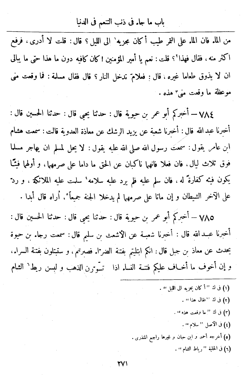 ٧٨٥ - أَخْبَرَكُمْ أَبُو عُمَرَ بْنُ حَيَوَيْهِ قَالَ: أَخْبَرَنَا يَحْيَى قَالَ: حَدَّثَنَا الْحُسَيْنُ قَالَ: أَخْبَرَنَا عَبْدُ اللَّهِ قَالَ: أَخْبَرَنَا شُعْبَةُ، عَنِ الْأَشْعَثِ بْنِ سُلَيْمٍ قَالَ: سَمِعْتُ رَجَاءَ بْنَ حَيْوَةَ يُحَدِّثُ، عَنْ مُعَاذِ بْنِ جَبَلٍ قَالَ: «إِنَّكُمُ ابْتُلِيتُمْ بِفِتْنَةِ الضَّرَاءِ فَصَبَرْتُمْ، وَسَتُبْتَلُونَ بِفِتْنَةِ السَّرَّاءِ، وَإِنَّ أَخْوَفَ مَا أَخَافُ عَلَيْكُمْ فِتْنَةَ النِّسَاءِ إِذَا تَسَوَّرْنَ الذَّهَبَ، وَلَبِسْنَ رَيْطَ الشَّامِ ⦗٢٧٢⦘، وَعَصْبَ الْيَمَنِ، فَأَتْعَبْنَ الْغَنِيَّ، وَكَلَّفْنَ الْفَقِيرَ مَا لَا يَجِدُ» ، «هَذَا أَشْعَثُ بْنُ أَبِي الشَّعْثَاءِ، وَاسْمُ أَبِي الشَّعْثَاءِ سُلَيْمُ بْنُ الْأَسْوَدِ الْمُحَارِبِيُّ»