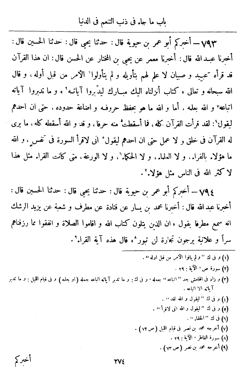 ٧٩٤ - أَخْبَرَكُمْ أَبُو عُمَرَ بْنُ حَيَوَيْهِ قَالَ: أَخْبَرَنَا يَحْيَى قَالَ: حَدَّثَنَا الْحُسَيْنُ قَالَ: أَخْبَرَنَا عَبْدُ اللَّهِ قَالَ: أَخْبَرَنَا مُحَمَّدُ بْنُ يَسَارٍ، عَنْ قَتَادَةَ، عَنْ مُطَرِّفٍ، وَشُعْبَةَ، عَنْ يَزِيدَ الرِّشْكِ أَنَّهُ سَمِعَ مُطَرِّفًا يَقُولُ: {إِنَّ الَّذِينَ يَتْلُونَ كِتَابَ اللَّهِ وَأَقَامُوا الصَّلَاةَ وَأَنْفَقُوا مِمَّا رَزَقْنَاهُمْ سِرًّا وَعَلَانِيَةً يَرْجُونَ تِجَارَةً لَنْ تَبُورَ} [فاطر: ٢٩] قَالَ: «هَذِهِ آيَةُ الْقُرَّاءِ»